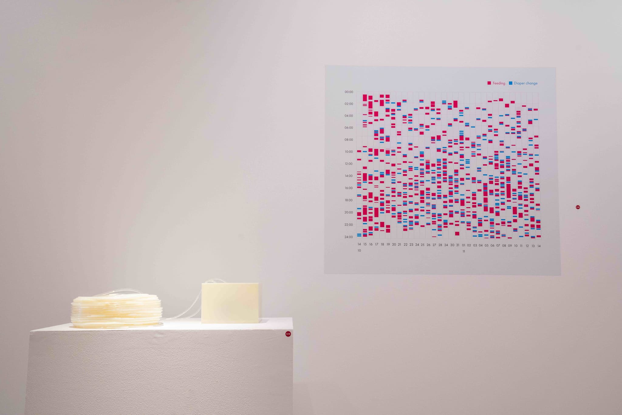 Ani Liu, Untitled (labor of love), 2022. Data containing the first 30 days of feedings and diaper changes in caring for Liu’s newborn. Vinyl. Courtesy the artist. Photo by Yukai Chen M’23.