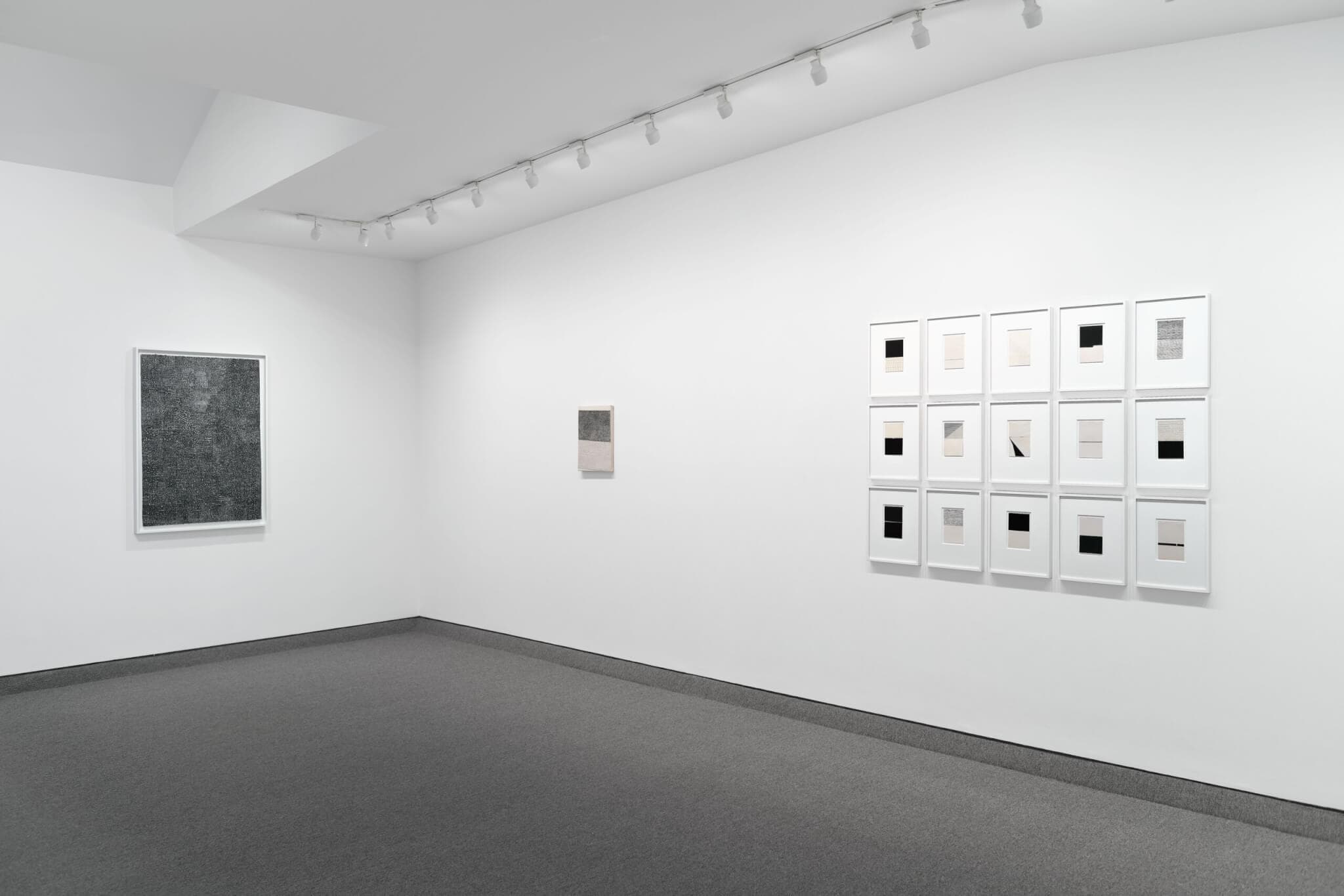In Sterope (2024), a pattern of dashes forms a grid of squares. The margins at the top and left are uneven. Printed askew, the pattern—a device from another time, the kind of template that was well-used when more clothes were handmade—runs to the right edge and the bottom of the 8 ¾ x 5 ⅞ inch page. With a pencil, Burge filled about half of the squares with neat circles such that a loose and wavy chevron pattern emerges when viewers stand back from the work. Across the gallery and about five times larger than Sterope, Star Data II (2024) is a tight and extensive variegated gray-black network of small boxes without any evident overall pattern. It could suggest skyscrapers in a dense cityscape or an earnest researcher’s attempt to impose a grid on the night sky. As Burge noted, “Both astronomers and weavers use grids to organize their information.” And, grids are abundant in the show at Krakow Witkin. For Electra (2024), Burge cut one apart and reconfigured it out of sync, the pieces at off angles like sections adrift—parts without the benefit of gravity to keep them attached. She started Star Data after considering réseau plates at Harvard, which use grid marks that help facilitate astronomical measurements. Points of negative space in her drawing refer to stars. “The grid works here as a reliable marker of magnification, focus, distance, and orientation,” Burge told me during a later conversation on Zoom. “I think of the grid as a finding tool, a guide, an infrastructure where organization or disorganization can take shape.”