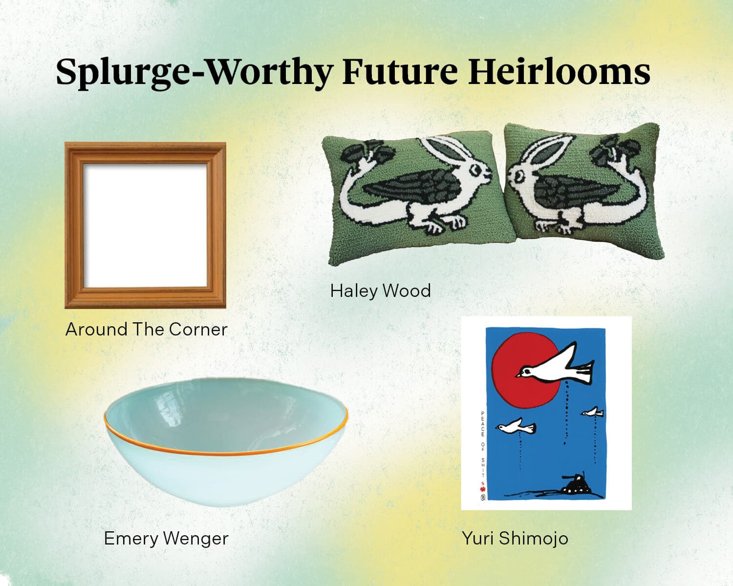 We can’t get enough of Haley Wood’s fantastical plush pieces. On rugs, pillows, and wall hangings, Wood creates characters and scenes that feel pulled from a storybook through a process called punch needling. Her chess piece-inspired pillows will fancify any room. They’re available via Artsy or Abigail Ogilvy Gallery.