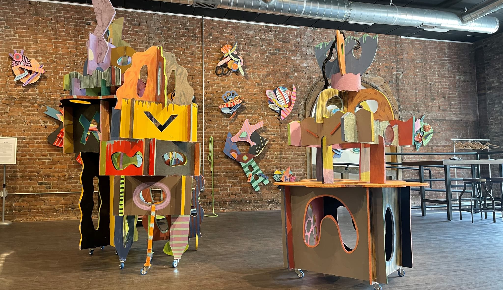 Nuzzled between popular Newton Centre destinations on Union Street, Nearby Gallery presents a fresh lineup of monthly contemporary art exhibitions by emerging artists. Launched amidst the pandemic, the artist-owned showroom and community art space is led by collaborators Cal Rice and Sam Belisle. As artists themselves, Rice and Belisle sought to create a hyperlocal space with exhibition opportunities accessible to artists in the community. With close to a dozen shows under their belts, their current exhibition is representative of the gallery’s mission to be a site for artists to experiment with one another. In turn, “Play Date” is a sculptural rendezvous between the spatially dynamic duo, Adria Arch and Jai Hart, that springs across the gallery’s upstairs space.