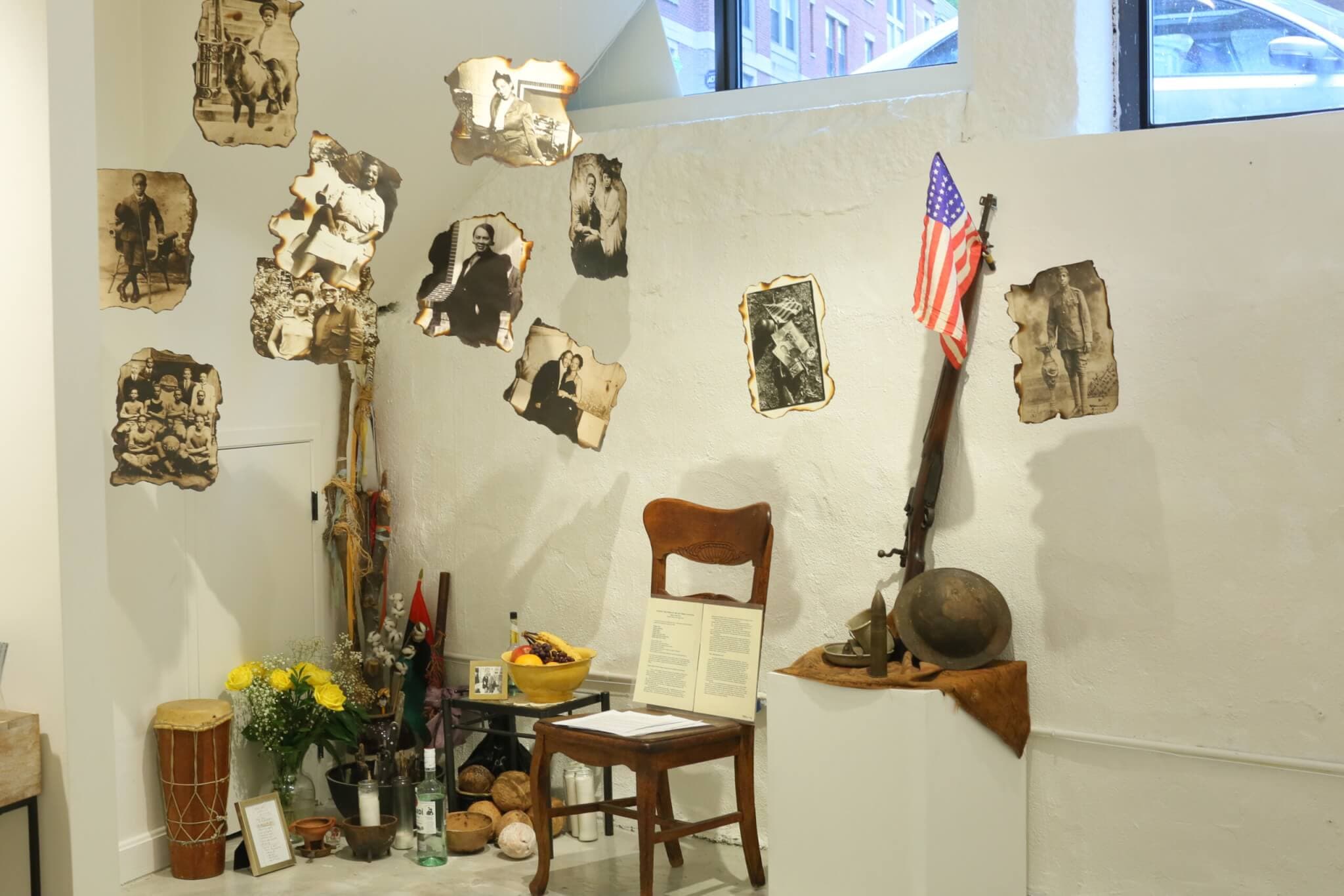 “Cheryl Miller: If We Stand Tall” offers a mélange of Black diasporic experiences, and signals that they are all at once bound and distinct. The title of the exhibition abbreviates the African Proverb: “If we stand tall it is because we stand on the shoulders of those who came before us.” Activating these words right at the front of the gallery, light from Harrison Avenue shines through the windows onto a community altar for the ancestors. Flowers, rum, bananas, coconuts, red grapes, and candles comprise the altar; photographs with their edges burnt are suspended above these offerings. A prayer for Egun (the Yoruba word for ancestors) titled, “WITHOUT THE POWER OF THE PAST THERE IS NO FUTURE: Egun In Our Lives” is presented on a nearby chair. Visitors may pick up a copy of the document and are invited to contribute to the altar. At the exhibition opening, several guests affixed handwritten messages to the ancestors to the wall across from the installation.