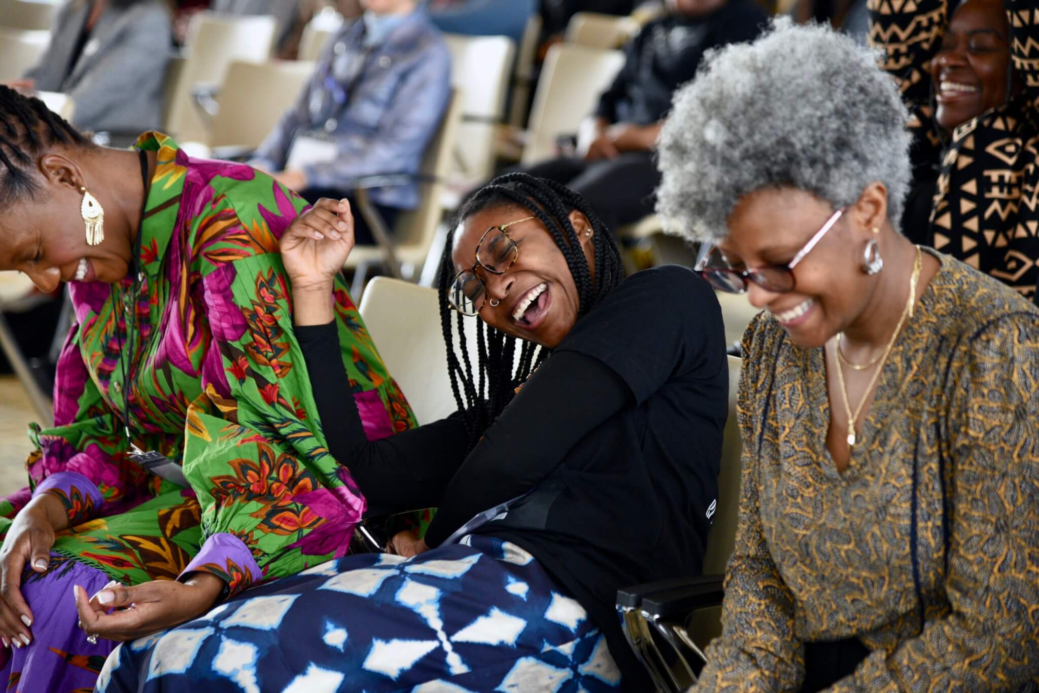 (left to right)  Régine Michelle Jean-Charles, Delita Martin, and Terri Lyne Carrington during the keynote conversation, “Talking Art,” at Northeastern University’s fifth annual bell hooks symposium. Photo by Vania J. Arroyo. Courtesy of Northeastern University.
