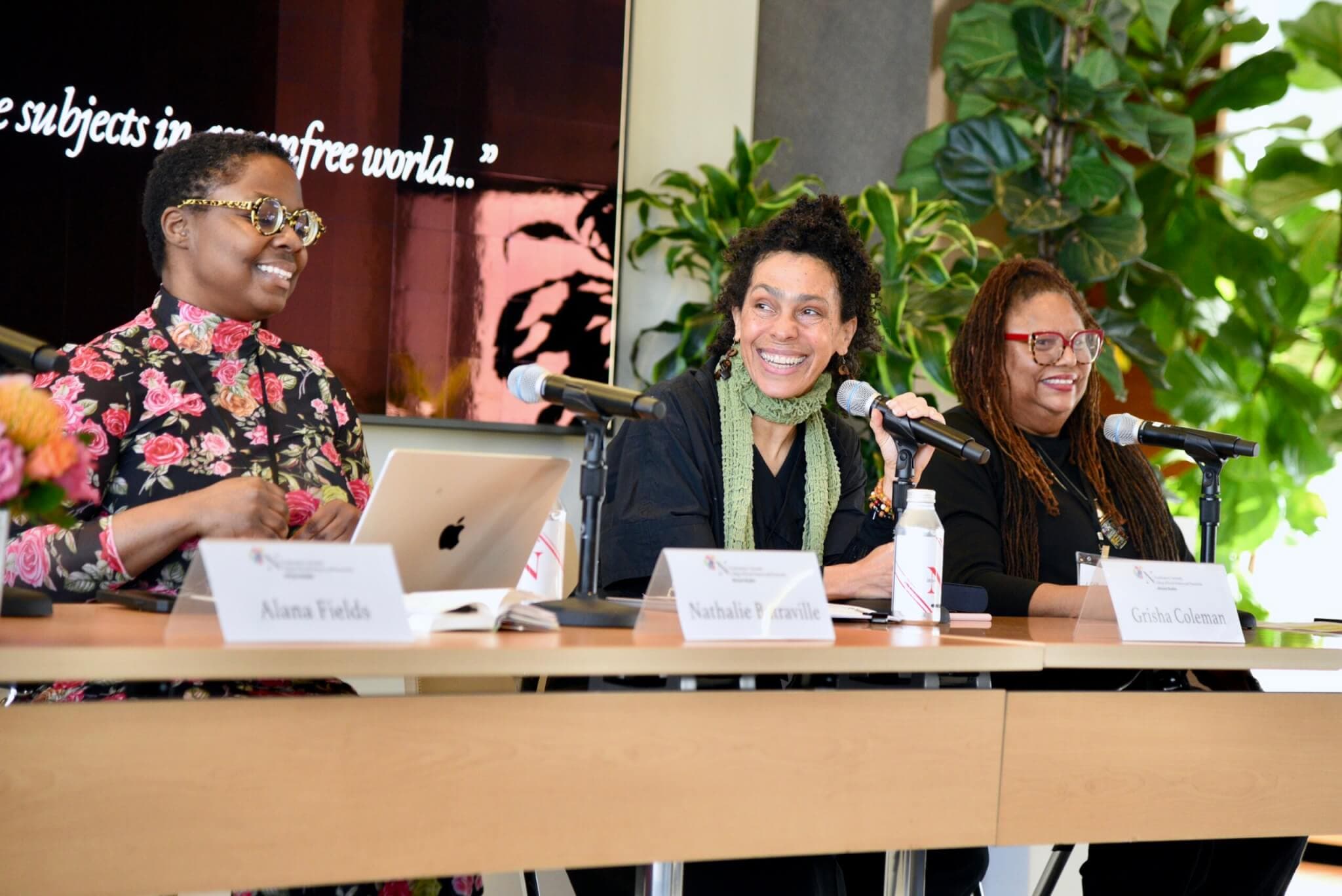 (left to right) Nathalie Batraville, Grisha Coleman, and L’Merchie Frazier during their panel, “Art on My Mind.” Photo by Vania J. Arroyo. Courtesy of Northeastern University.