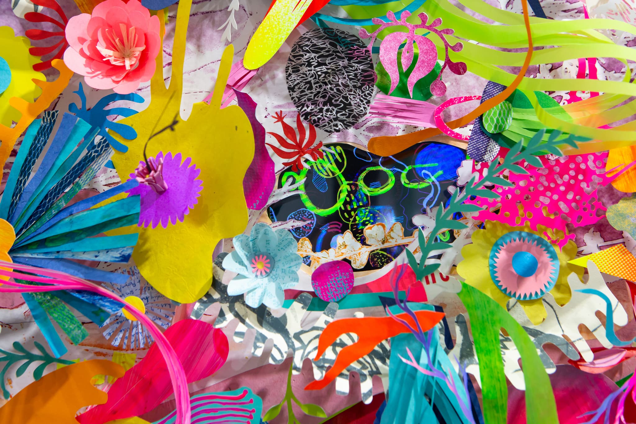 “I’ve been trying to keep away from purely digital work,” Erdelyi notes. “Partly I think it’s just because I have this background with craft and working with my hands and touching things, so I consider the work I’m doing a hybrid animation process. It’s analog and digital combined.” That’s also true of her second work in the exhibit, a new wall piece called Ma Femme Maison (2019) that presents two exuberant collages connected by a hot-pink umbilical cord. These riotous forms arise from found papers and monoprint scraps that have been carefully cut like lace, bored with holes like Swiss cheese, or fashioned into orbs, organs, feathers, and flowers. Most of the colors are neon-bright hues hard to find in nature, but the shapes are organic, by turns botanical, aquatic, anatomical, cosmic. Each wild yet delicate assemblage surrounds a small LED screen that plays looping animations inspired by nineteenth-century drawings of developing embryos.
