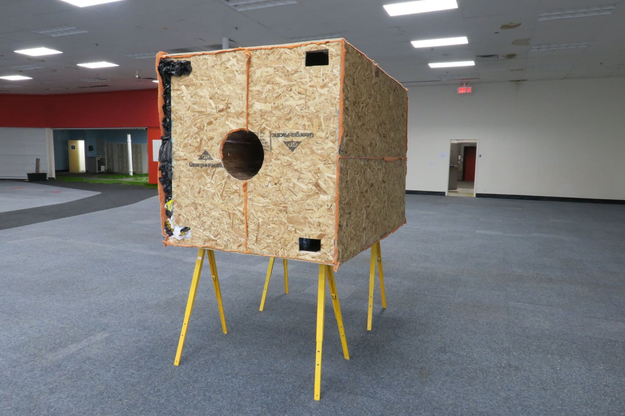 “Sculpturecore” represents the first time that BU’s MFA sculpture thesis show has been held in an off-campus site. This year’s class—perhaps the largest cohort the department has had, at least in the six years Snyder has taught at BU—knew they wanted to create large-scale installations, necessitating a space that could accommodate their visions. The artists brainstormed alternate venues, thinking they might find an unused commercial space, and the idea of the building that formerly housed a CVS arose. They reached out to the spot’s parent company and worked with the school to coordinate insurance issues, supported by Snyder and Dana Clancy, the School of Visual Arts Director. Along the way, they worked with the BU Risk Management team, to make sure the space was safe and up to code. When they encountered obstacles, such as damaged carpeting and ceiling leaks, they strategically adapted their installations: for example, Abdelnasser planted grass directly below the drips of water so that the plant life could thrive.