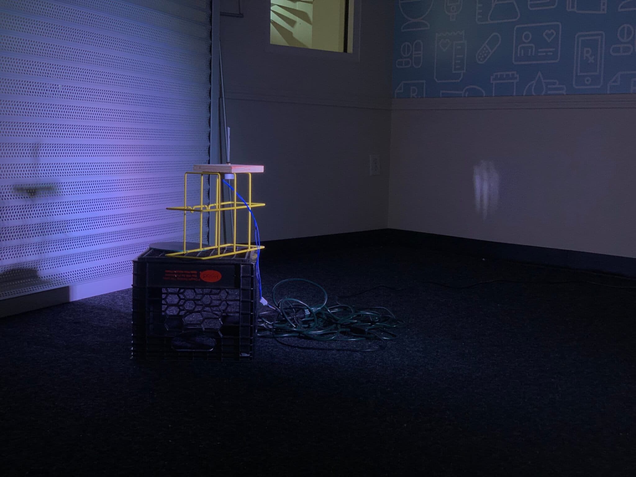 The space is accented with two towers of Diet Coke cans, an installation by Grey called Columns. Like Coughlin, Grey uses a popular element of American society as material foundation for a statement. Drawing inspiration from the idea of pedestals, her work leads the viewer to interrogate what it means when our support systems are not more stable than a beam constructed from recycled cans. Can we really control our worlds, like the steeples Grey has created from a symbol of commercialization? Or maybe there are some things that we can’t, as represented by the works from Abdelnasser. Throughout the first floor, she has planted patches of grass grounded in soil embedded in the carpet. In pieces like I think it’s dead, a white picket fence emerges from the earth. Nature is a force that we do not have power over, despite our attempts to harness it or rein it in through the things that we build. Surveillance, a modern-day effort to control, figures into Abdelnasser’s work as well: multiple cameras hang from the ceiling above one of her installations, while in a back room, presumably used by the pharmacy as a break room, a monitor offers spectators a view of one of her pieces that remains concealed, difficult to observe. Yang’s work every raindrop is a punishment interrupts this spell for a moment—a structure symbolizing a lighthouse and made from a black crate and a shard of mirror is illuminated by the projection of light. While the sculpture is made from something broken, it remains a symbol of hope.