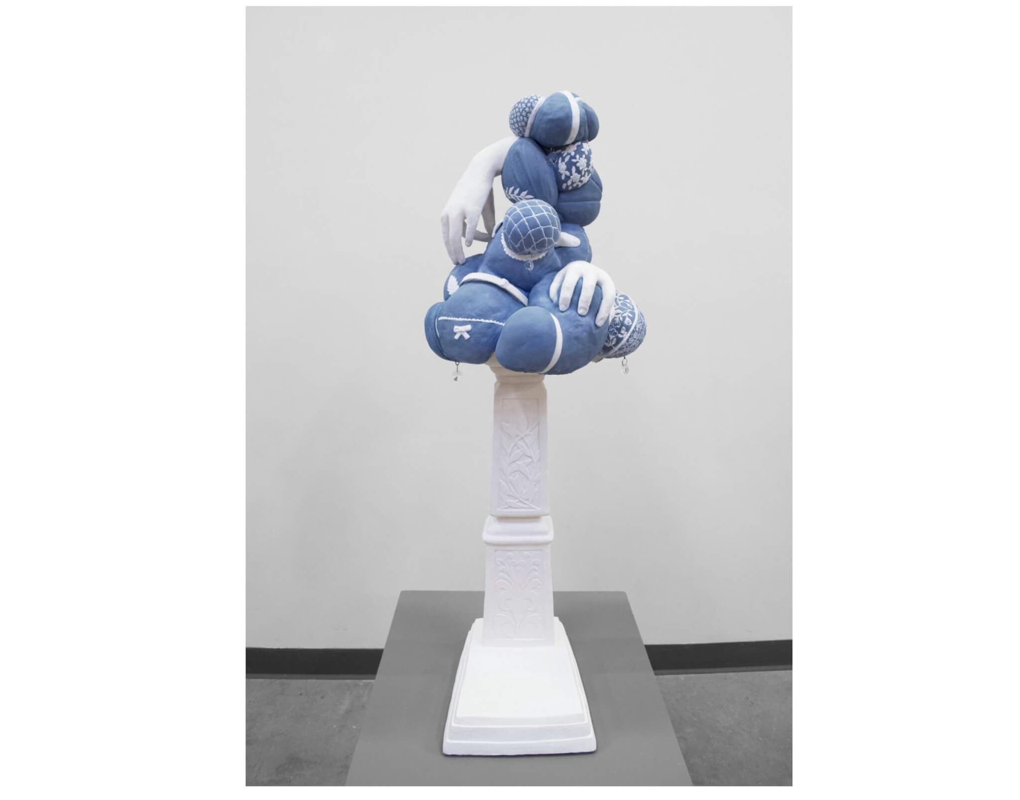 Blueprint (2025) is a conglomeration of blue limbs twisted around each other atop a pedestal. Large white hands grow out of the sculpture, grabbing at itself—an effect generated by the shaping of the hands and indentations in the spots where the fingertips touch. Perhaps these hands are acting as a protective measure, desperately holding onto the body in an attempt to reclaim self-ownership—or perhaps, more cynically, they are someone else’s hands, predatorially grabbing as they enact control and constraint.
