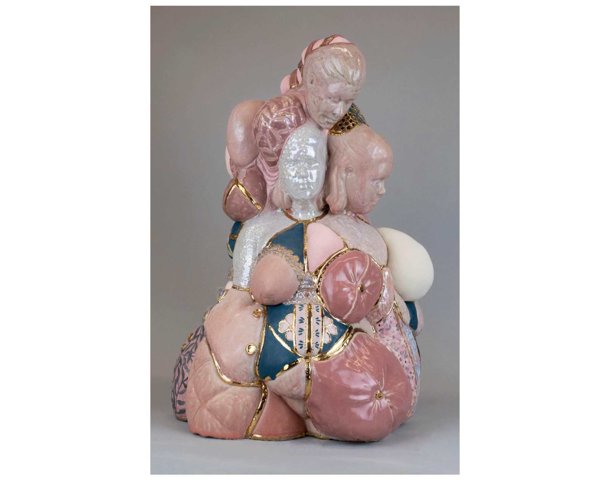 There is a dissonance between the grotesque contortion of the bodies and their ornate decoration. The sculptures’ surfaces are adorned with glazes of soft pink, blue, and yellow, along with floral patterns, inspired from Victorian wallpaper, in the same colors. Strings of pearls and dainty glass beads dangle from the pieces. These details echo the ways many women seek to enhance their physical appearance. While this is a practice that can foster confidence or comfort for some, the bodies’ distorted positions in this exhibition do not elicit such positive feelings. Instead, the contrast is unnerving and illuminates the darker side of beautification processes, particularly in the context of societal pressure to pursue unattainable beauty standards. The bodies depicted here are coated in delicate beauty, but their suffering is not truly masked, creating an unsettling juxtaposition.