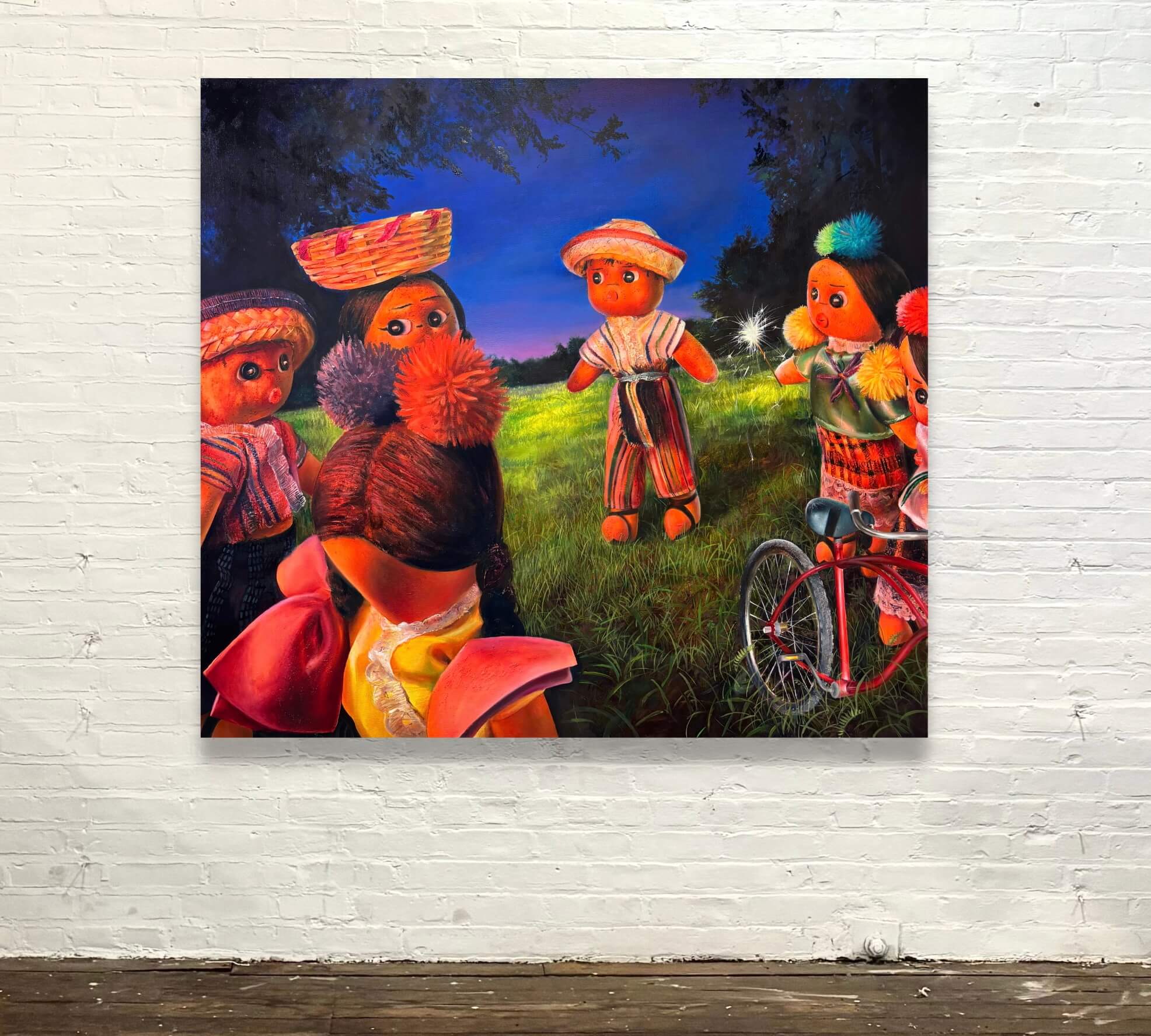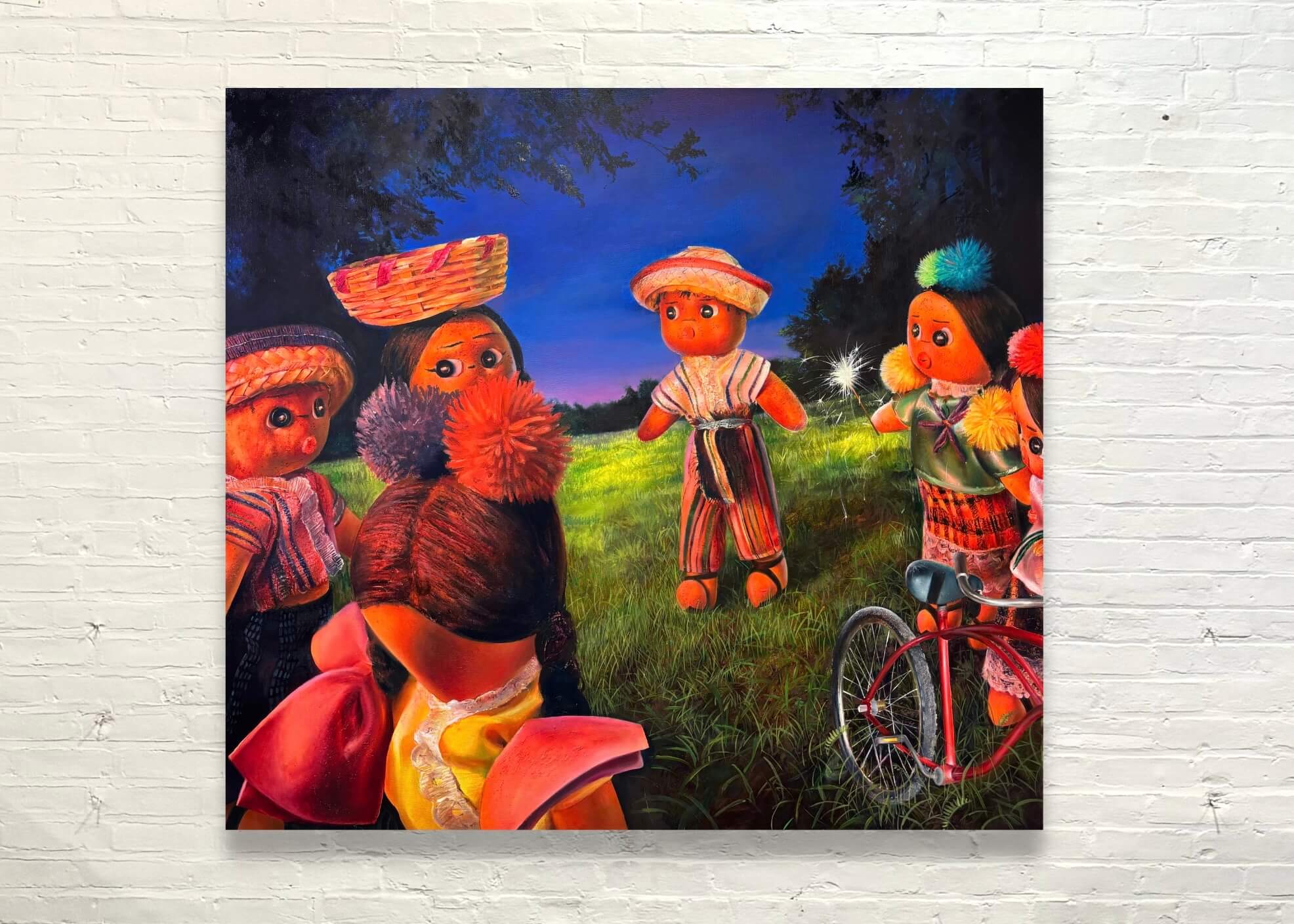 I encountered Dominick Cocozza’s charming depictions of a Guatemalan worry doll in a small group show juried by Kate McNamara at Gallery 263 last spring. It was just one painting—a doll with a round face, a bright red “O” for a mouth, and wide, glowing eyes staring at a drawing of a figure with long braids—and I couldn’t get it out of my head. Cocozza is a 2024 RISD grad who moved to the US via adoption in 2002 and hadn’t returned to Guatemala until a trip in 2022 that allowed him to reconnect with his Latinx Indigeneity and Maya Tz’utujil heritage. It was a trip that shaped much of where his art practice is today. At Aunty’s House, Cocozza will present eleven recent paintings with dolls dressed in traditional Mayan textiles engaged in a variety of actions, domestic scenes, protests, play, and friendship—some as proxies or avatars for the artist himself. —Jameson Johnson