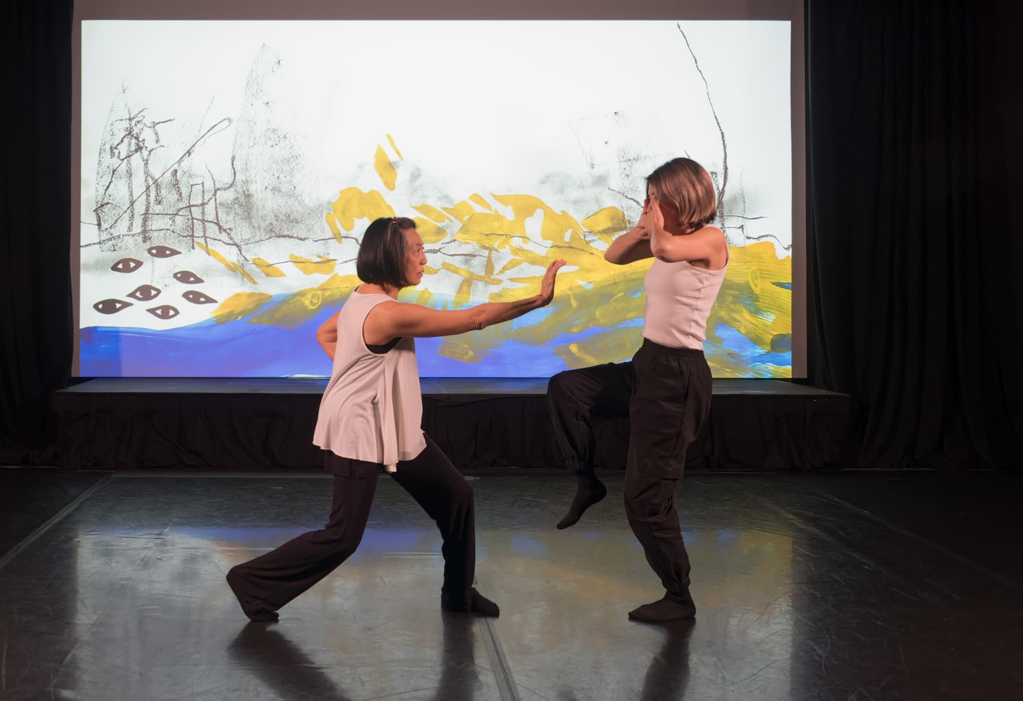 In GHOST ROOTS, viewers experience the motion and style of Kim’s visual art and the intimate and expansive choreography of Chan. Heavily influenced by their stories, the motions of both art forms signal transitions and visualize metaphors used in the narratives. It is a reminder of the ancient aspects of community care and the assurance and identity found in storytelling.
