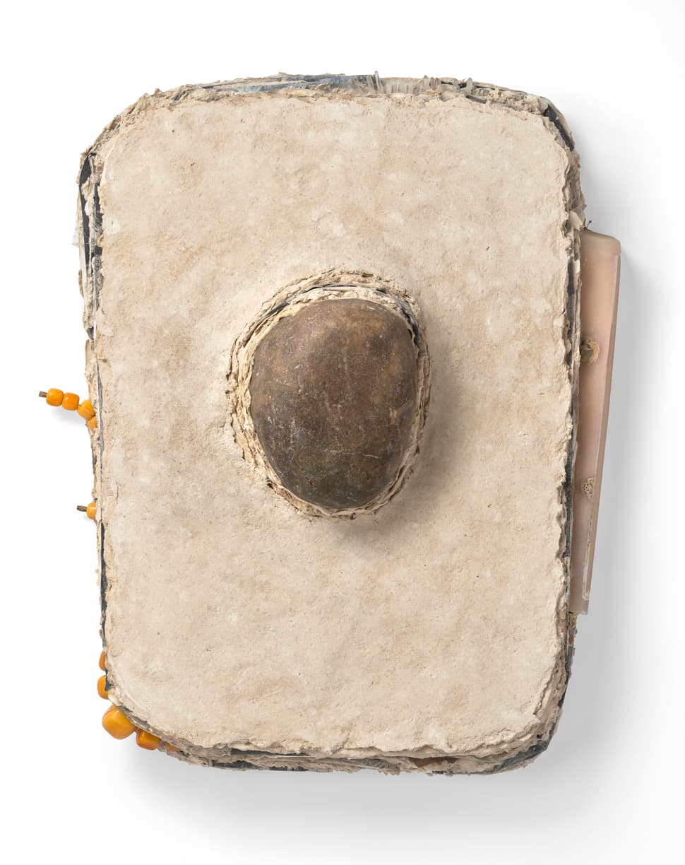 Paperweight (Amber Bead), (2018). 26” x 22” x 5”, various fabrics, paper, stone, personal items. Photo: Stewart Clements.