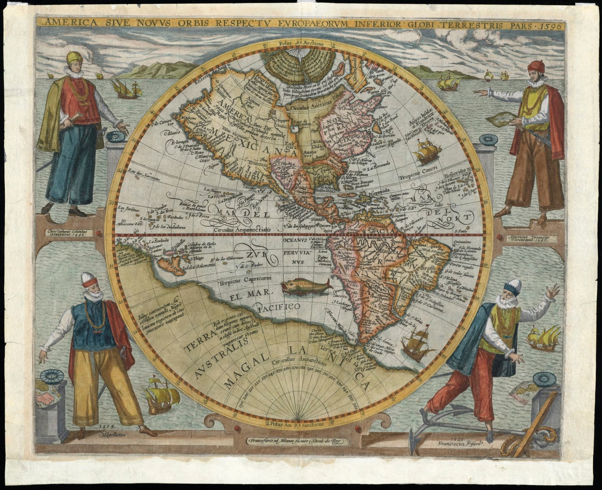 Theodor de Bry, America sive novus orbis respectu Europaeorum inferior globi terrestris pars, 1596. Copperplate engraving. 11” x 11”. Courtesy Addison Gallery of American Art.