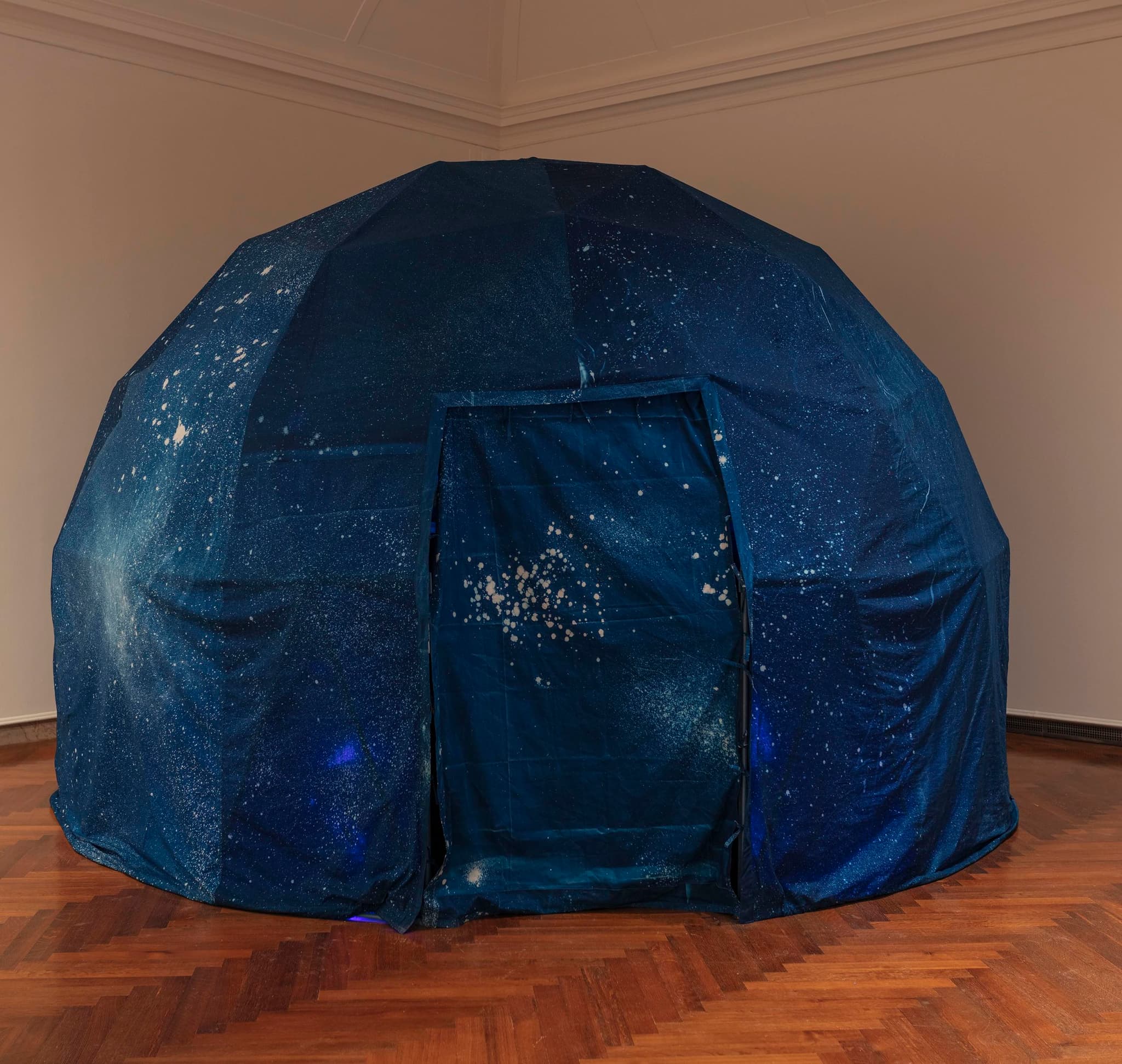 Andrea Chung, an American artist of Jamaican, Chinese, and Trinidadian descent based in San Diego, had the most self-contained and haunting response to these maps. Her work The Westerlies: Prevailing the Winds is a dome covered with cyanotype on cotton, creating an inviting yet stark stage set for an individual to contemplate an imagined seascape at night. An empty little white boat with oars rests to the right. Suddenly, a friendly and mysterious disembodied whisper sounds through the dome, and we might infer that is a warning from the ocean and the sky. Knowing exact boundaries, this work implies, is overrated, and different priorities enable a familial, protective connection with homelands.