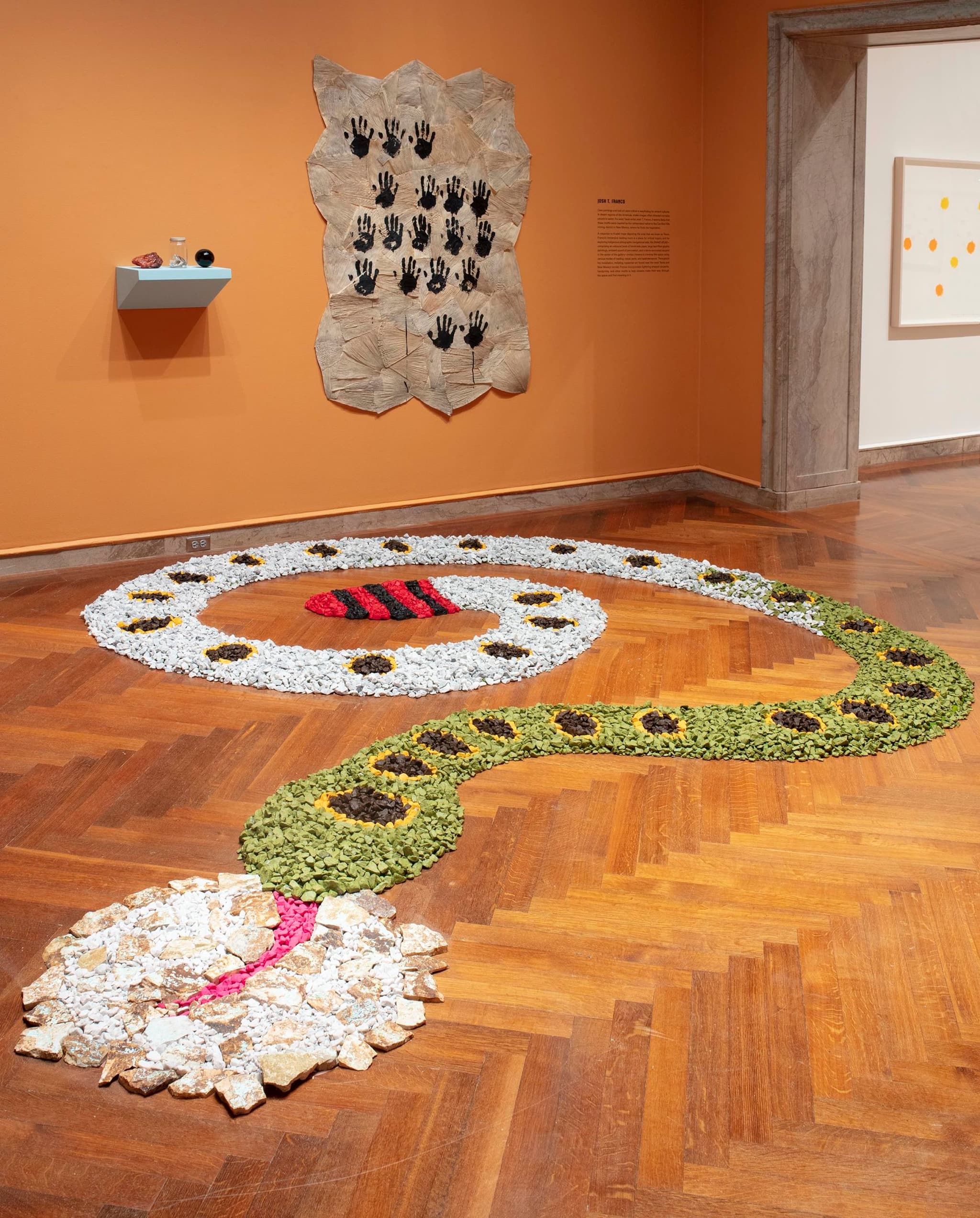 The most refreshingly disruptive of the offerings, particularly in the formal setting of the Addison Gallery, is an immersive reading room entitled SNAKE ATLAS (serpent lightning leads to water; for my father who was bitten, so that rattler also resides in me) by Josh T. Franco, a Chicano and Texan who currently lives in Maryland. The room has a warm and abundant feel accentuated by an upbeat, rollicking sonic land-scape made for the installation by ambient/experimental musician Chad Turner. The stimulating combination of materials includes handprints upon corn husks, art historical quotes upon a painted grid of 35mm projector slides, and even a rattlesnake head in a jar (an artwork by Robert Smithson) on a shelf flanked by pieces of gold quartz and golden obsidian. In an elaborate, map-like drawing, a handwritten passage from Cormac McCarthy’s 1985 novel Blood Meridian encompasses the pictograph of a horse and rider, further bordered by engaging marginalia, including a phrase that is part of the work’s title, “fuck the Judge.” The star of the room is a large snake sculpture made with thousands of multicolored marble chips. Snakes traditionally lead desert peoples to water, so sighting one would be of more use than a map. It is the only work in the exhibition to refer directly to the earth by bringing pieces of it inside and placing them back upon the ground.