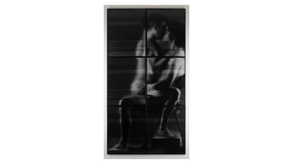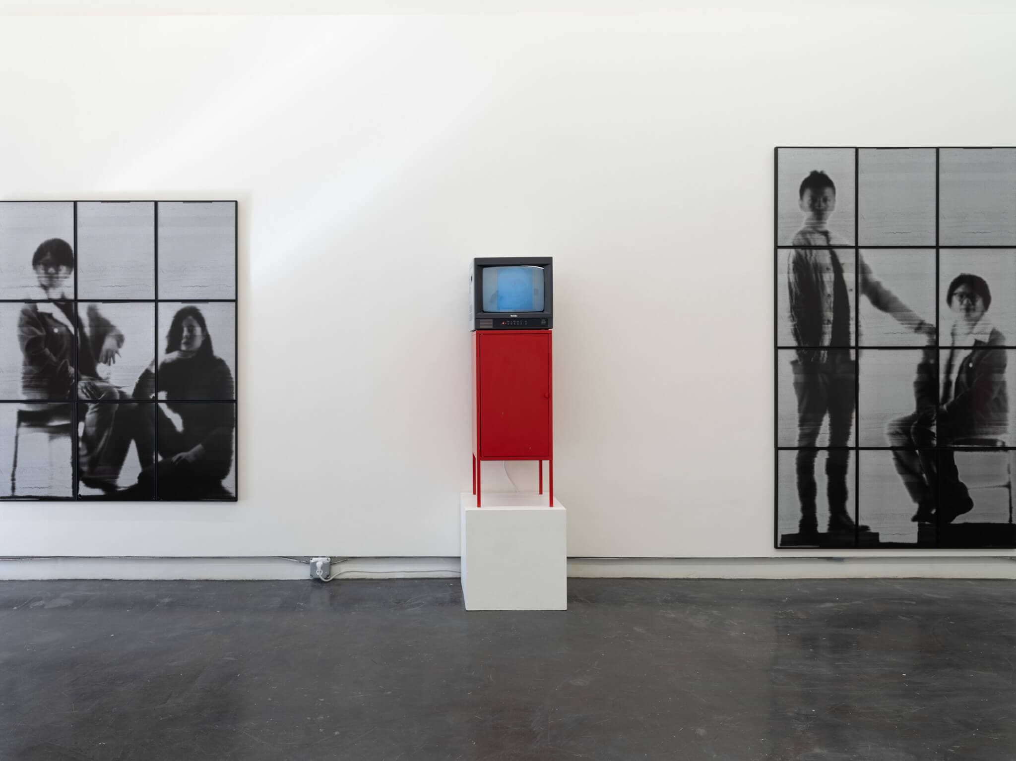 Eight works in the show are from Shen’s Straw Inscriptions series, begun in 2020. Building on four years of research and six months of technical experimentation, Shen devised a lensless apparatus comprising 28,000 mass-produced black drinking straws glued together by hand. The photographic portraits—collaborations with members of Shen’s familial and personal community—generated through this process are inscribed, so to speak, onto 20” x 16” direct positive gelatin silver paper, emerging simultaneously as image and unique object. Here, they are mounted on the walls, singly or in gridded arrays, at monumental scale. In their allover blur and their black, white, and gray tones, they appear distinctly “low-res,” a sharp refusal of the hi-res snapshots produced by any smartphone today. Up close, you begin to appreciate how textured these two-dimensional surfaces are. Minor imperfections and misalignments in the straw openings and groupings show up as irregular striations across paper. Shen tells me it takes roughly ten seconds to expose each portrait, with the multigrid works requiring up to twelve different exposures. You sense this accumulation of time across the images, perceptible as a slight wavering effect resulting from the sitters’ natural motions. The closer you get to the surface, the more clearly you see each individual straw opening—the unusual “pixels” or grain of these portraits.