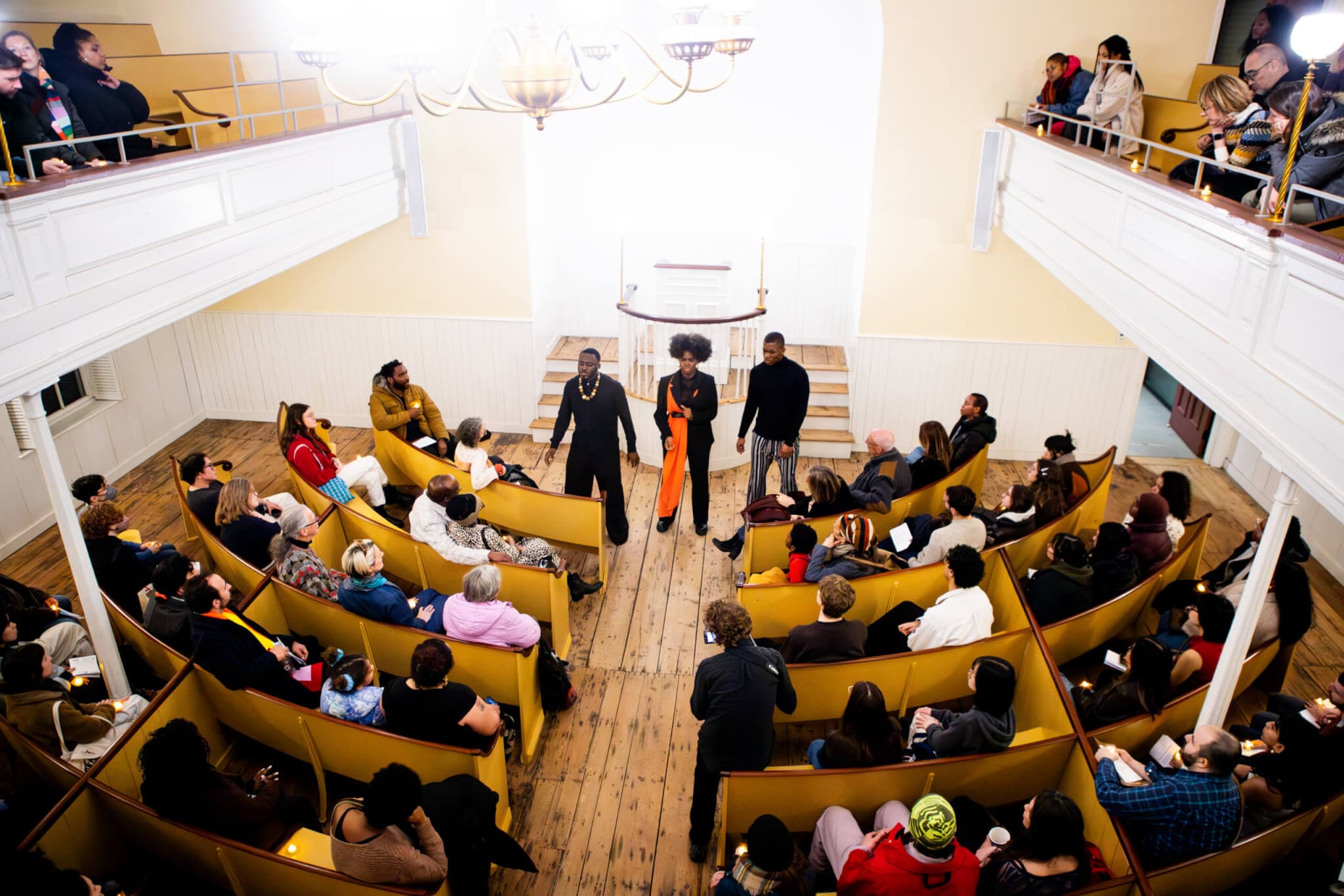 Performance view of Jonathan González with Ogechi Okoye, Ifeanyi Epum, Valentine Umeh, "suite for a minor meeting," February 28, 2026, African Meeting House, Museum of African American History and Tufts University Art Galleries. Photo by Cat Lent.