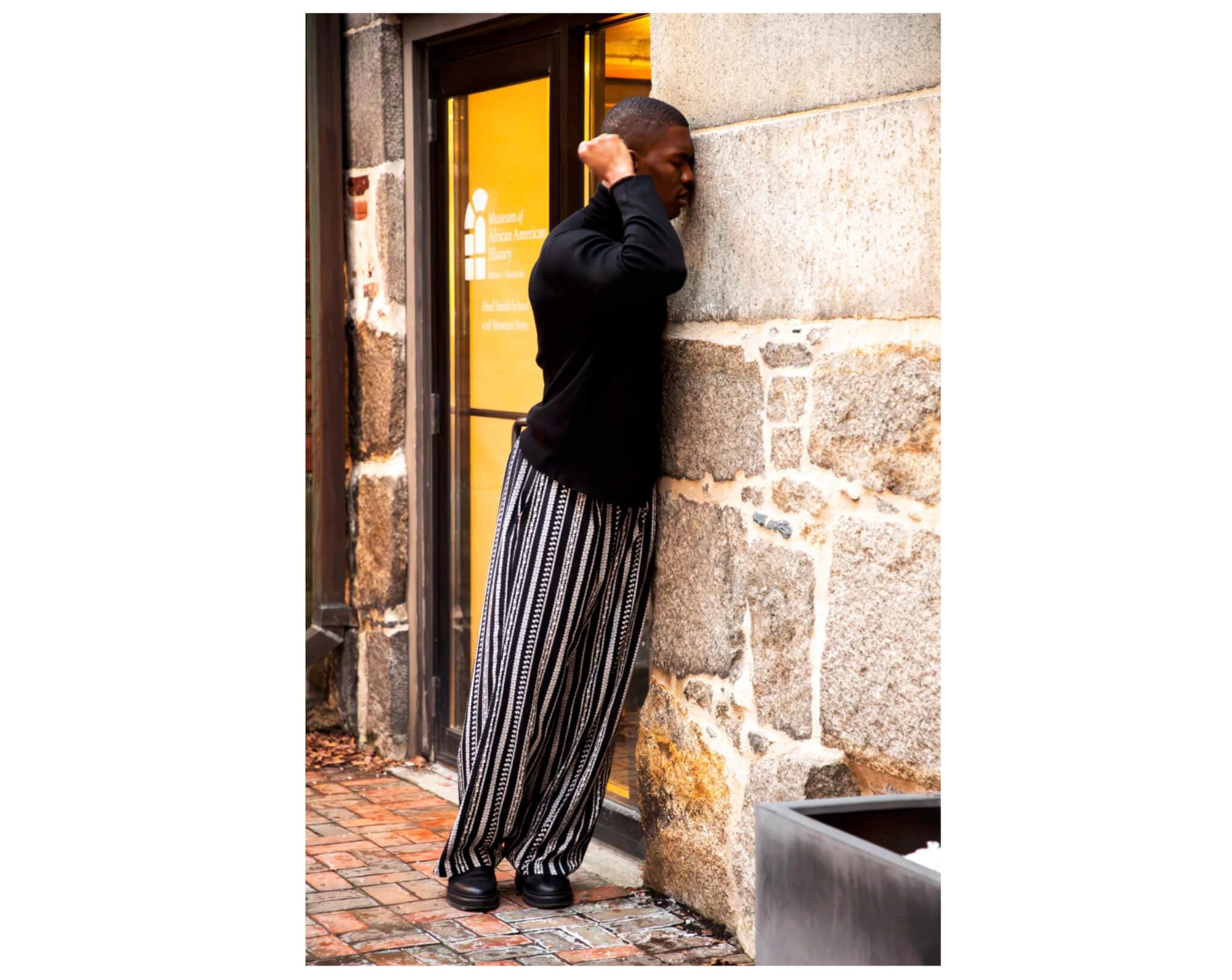 At the start of Gamin, members of the audience could rarely see all three performers at once around the edges of the African Meeting House. Each performer stood at a different position, distanced from the others, performing independent choreography while exploring the surrounding streets. Audience members could catch varying glimpses of each performer or opt to focus their attention on one for the duration of the performance. I focused my eyes on Umeh, the first person in my line of sight, as he solemnly traced his fingers across the building’s exterior, pressing his ear to the stone wall and pounding on it with a tight fist. At times, he moved suddenly, as if in fear—what was he anticipating? It seemed as if phantoms were ushering him to listen to the building itself. I could not see Epum and Okoye, but I could hear the distant sliding and stomping of their feet on the pavement. At the TUAG panel, González mentioned that the performers referenced the story of Mrs. Dorsey, a formerly enslaved woman who took shelter in the house. The title of Augusta Savage’s Gamin is a French term for a streetwise child, or “street urchin.” To be streetwise was to be constantly alert, cautious of one’s surroundings. Umeh’s frantic movements, then, performed Mrs. Dorsey’s own necessary street smarts to evade being captured.