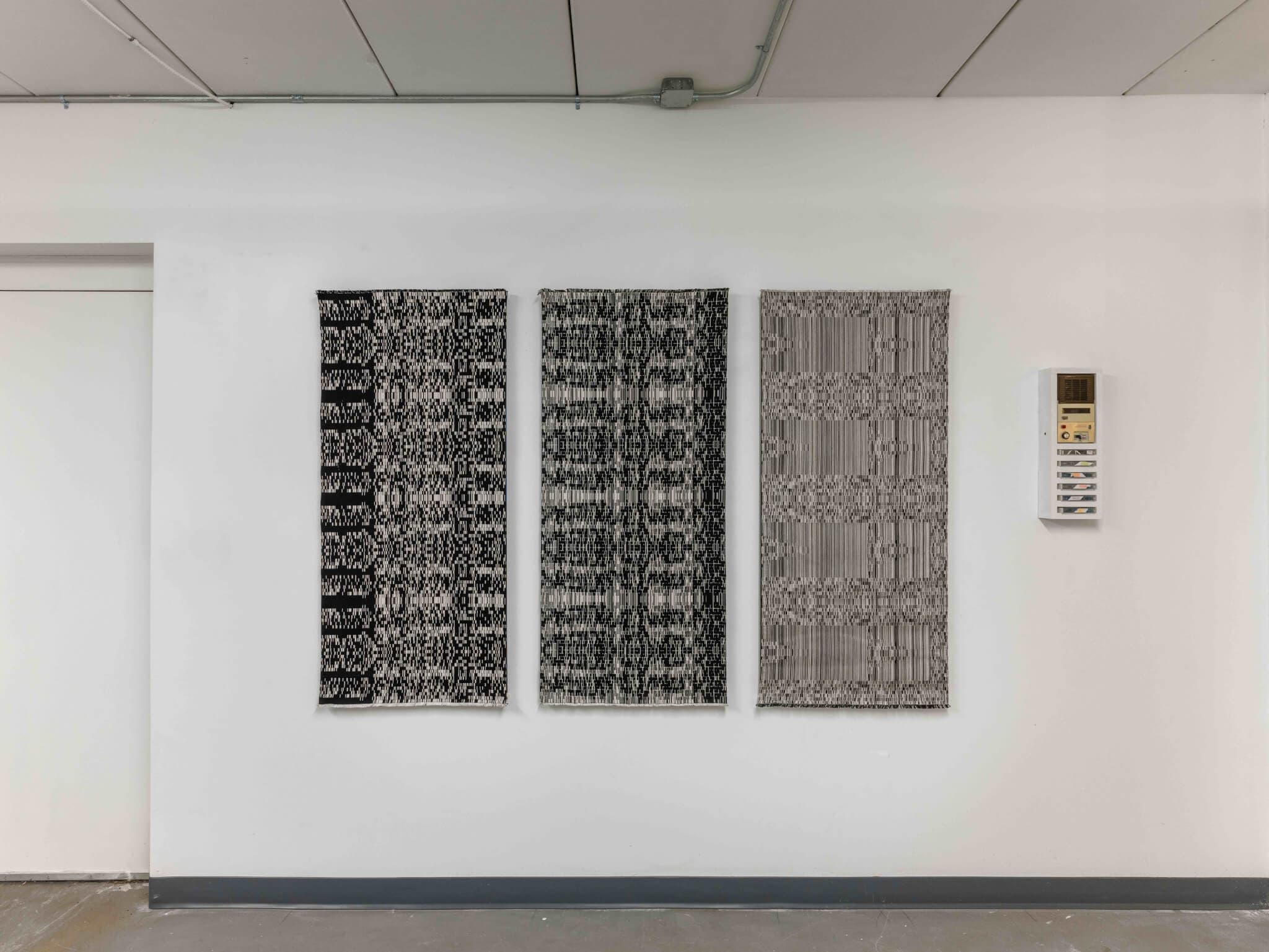 Jacquard textiles made during her 2015 MFA in textiles (RISD) are reworked as sculptural installations. In determining how best to display Hong’s varied body of work, McNamara and Hong settled on this technique for her textiles. McNamara remarks how the metric of Hong’s physical body is in each of the wall hangings: they can be spread only as far as her wingspan, and then shifted, scrunched, and pinned to the wall as indexes of Hong’s movements through space and time. Other weavings are stretched or laid over geometric frames, taking form as a tube, a triangular tunnel, and a draped undulation. Their playful colors and unexpected shine of metallic threads complement the densely worked surfaces. She doubles down on the layered meanings of the laborious process of jacquard weaving in Bit Map (2015). The binary code embedded in the black and white weave is accompanied by a cassette tape that plays the mechanical audio of the massive loom producing the work. In Hong’s conception, the sound could be re-translated into code that programs a new weave pattern—an invitation to explore endless (mis)translations between the textures of the sonic, visual, and physical.