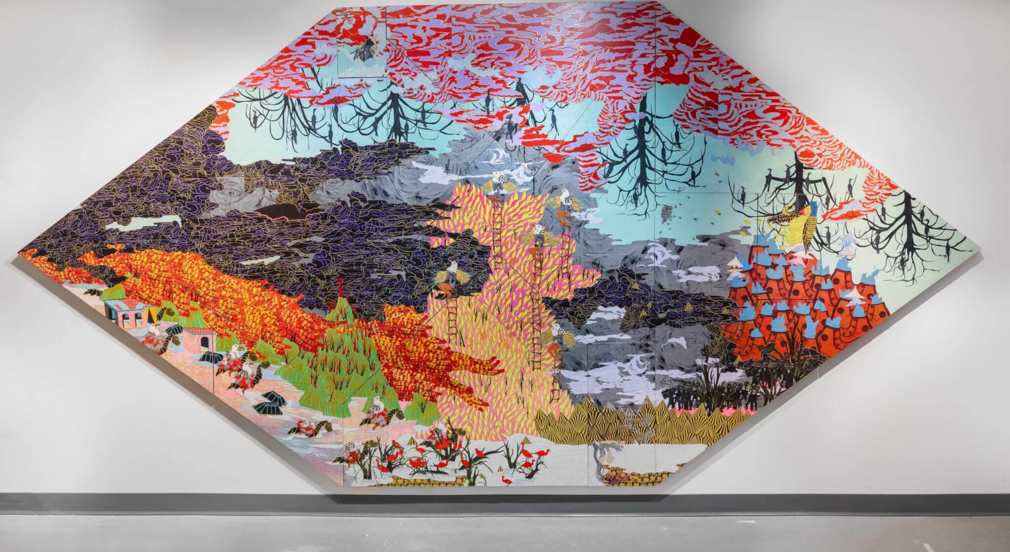 Though references to gender, race, and immigration are visible in the imagery of her early works, Hong remarks that it is relatively recently that she’s self-consciously re-examining her processes through these now more prevalent discourses. One of the major themes that is woven through each work, perceived newly through these lenses, is physical labor. Hong notes that she worked in the puzzle-like format of Setting Sun so that she could make monumental pieces while still being able to fit them in her car. As a young woman artist, she very much felt she had to be able to take care of everything herself.