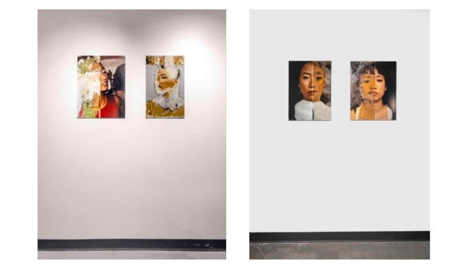 Hong’s most recent work emerges from this liminal space between body, physical process, and image. Her 2024 self-portrait series is the product of mistakes: the inkjet prints of low-res cell phone photos of photographs—cropped photos of her hands, childhood portraits, and other glimpses of herself—that have been reworked and collaged are full of visual glitches. When first printing these photographs, Hong accidentally loaded the photo paper backwards, resulting in a poor image that “simultaneously looks forward and backwards, embodying a transition into something new altogether.” Here, the trace of labor (including its mistakes) makes the image; the glitches evoke the fallacy of memory and the gap between who we are and how we’re seen.