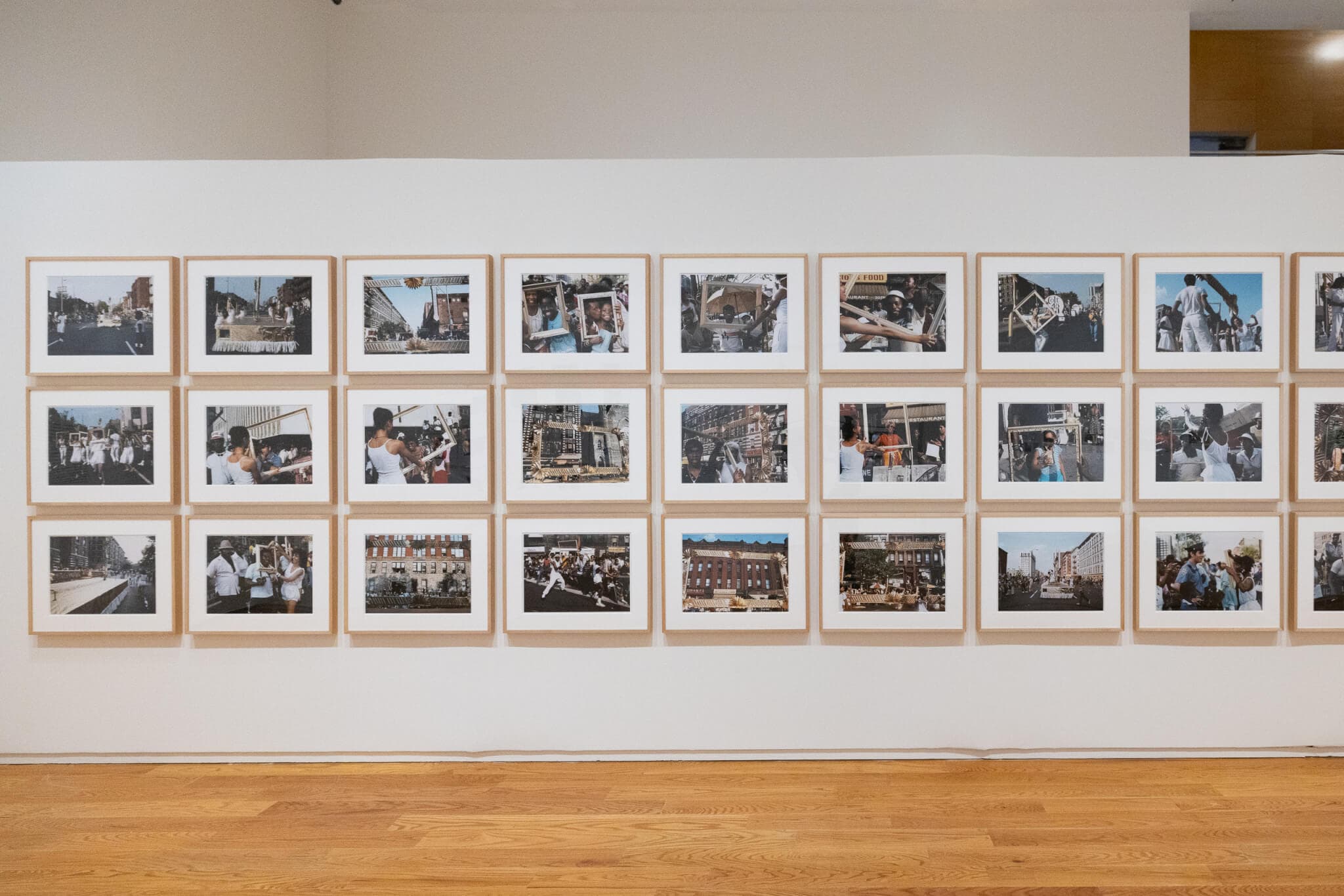 Visitors weave through the lower-level galleries in sections to take in twelve bodies of work from O’Grady’s oeuvre across four decades. The galleries feel like a maze, with many of the walls reaching only partially to the ceiling. Vitrines display objects from O’Grady’s personal archive: one presents a small yellow cap with the white numbers “55,” marking the artist’s class year at Wellesley, next to yearbook photographs of her; others showcase letters to fellow conceptual artist Adrian Piper, drafts of project proposals, and performance scripts.