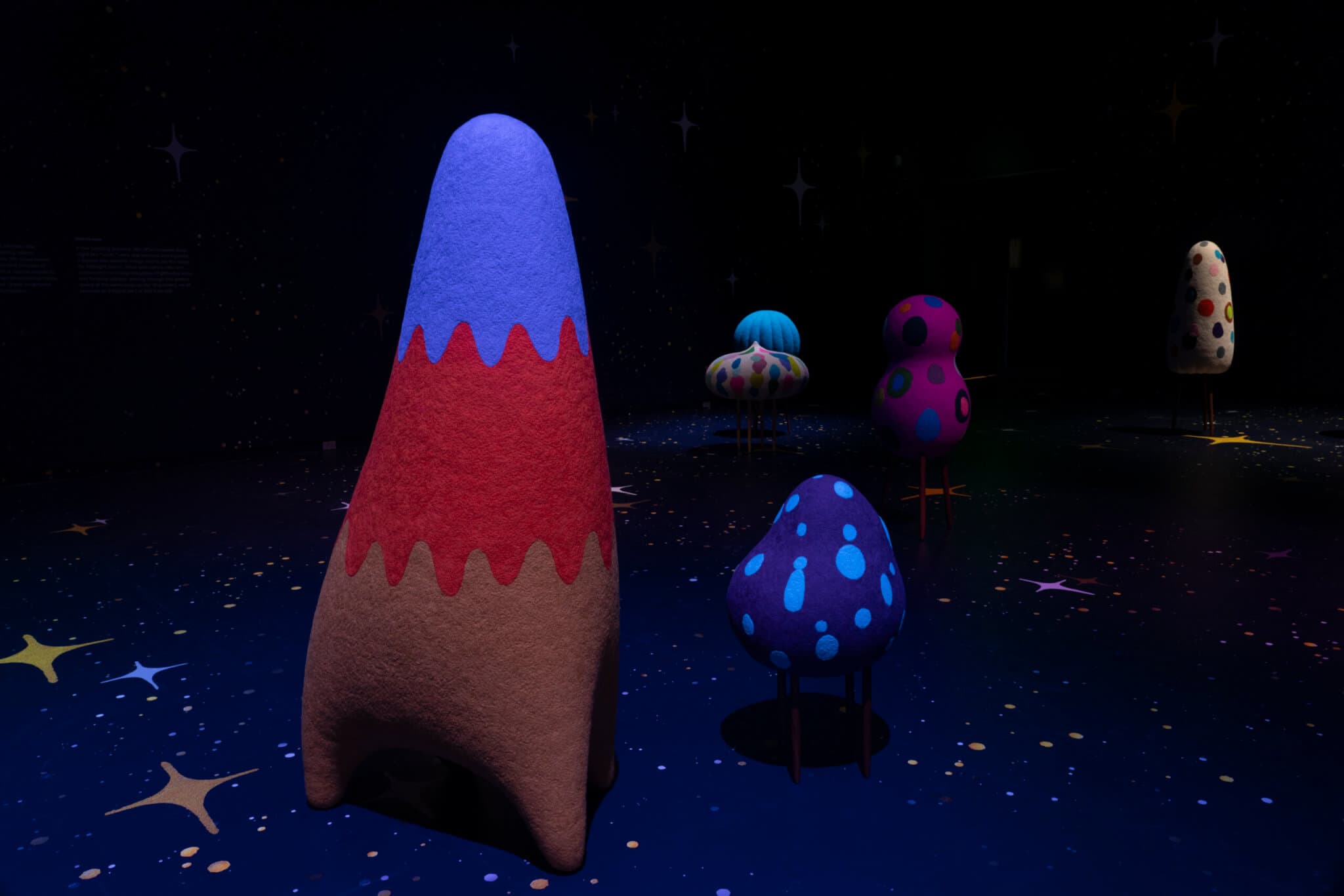 Felted wool sculptures positioned in a dimly lit room.