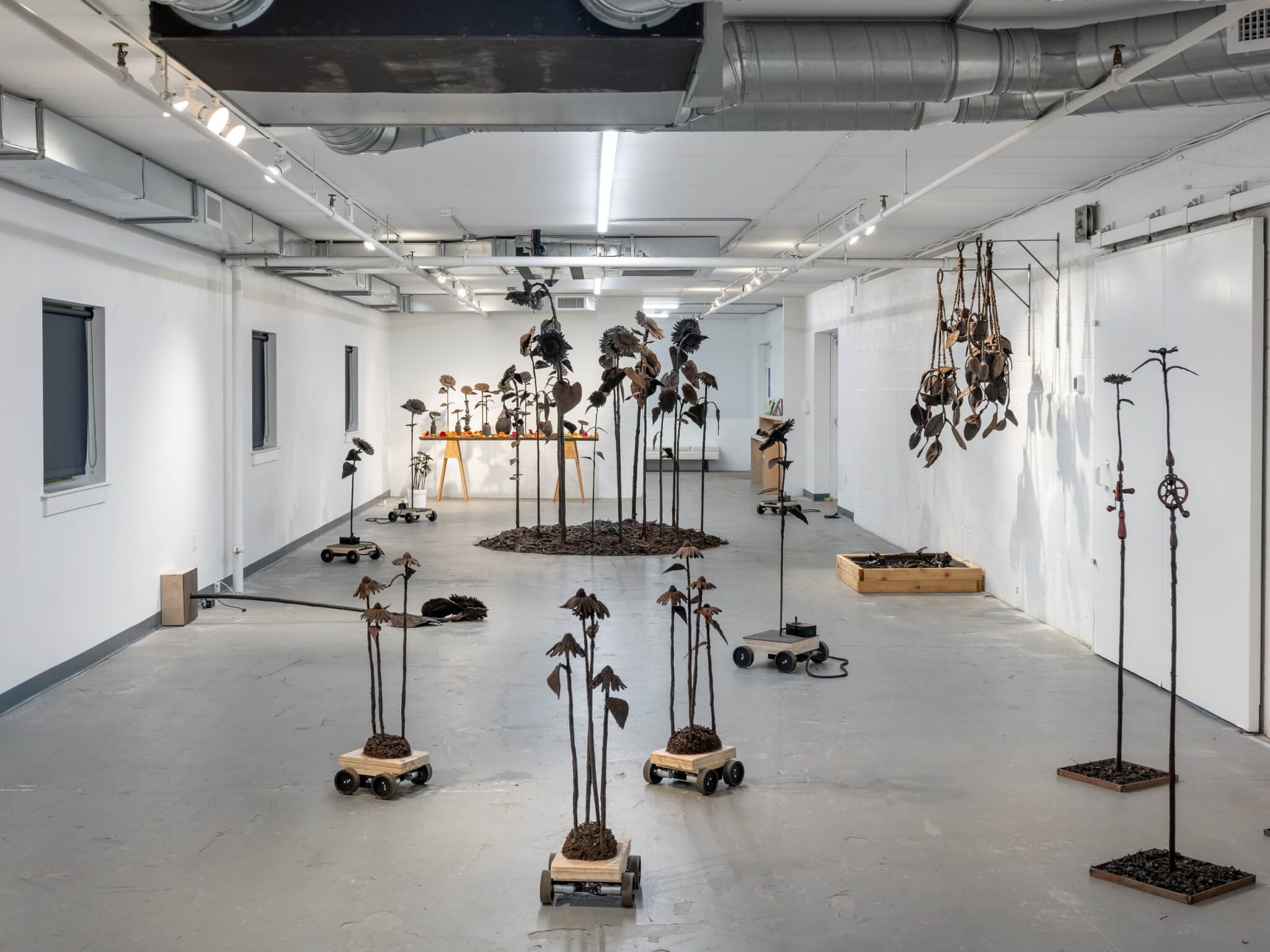 With charm and wit, Tory Fair’s “Protest Flowers” turns the gallery into a field of unexpected contradictions. Fair’s kinetic sculptures are rubber-cast sunflowers laced with dirt that perform a series of strange choreographies. Peeking out from boots, towering over ten feet high, or attached to tiny carts, the silicone flower sculptures protest their own obscure artificiality while performing their floral ornament duties. Some tremble on the floor in slow spirals, some are cheeky and mobile, others respond to remote controls guided by visitors. Fair situates her work within a canon of ecofeminist artists who employ abstraction, land interventions, and performance to call attention to the state of the planet while fostering moments of connection, humor, and reflection. —Jameson Johnson