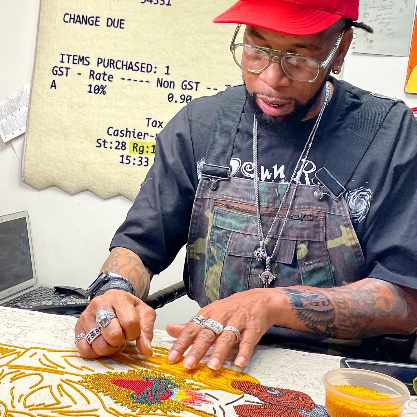 This sentiment was also articulated by Big Chief Demond Melancon, a Black Masker who leads the Young Seminole Hunters of the Ninth Ward. Melancon and his studio were not on the Prospect map, but we were fortunate to visit his Eighth Ward studio, where he lives and works with his wife, Alicia. Melancon has beaded and created fantastical suits for Mardi Gras all his life, but only declared himself an artist six years ago after gallerist Arthur Roger saw his work and invited him to show in his Julia Street gallery.
