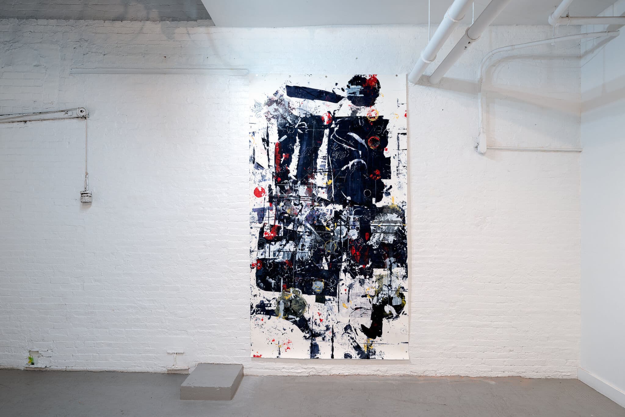Schnee first experimented with printmaking as a form of activism during her time in Portland, Maine, upon graduating from Bates College and receiving an honors BA in American cultural studies. She is now pursuing an MFA in painting at Bard while working as a teaching fellow in art, film, and visual studies at Harvard. From the dialogue between print activism and painting’s properties emerges one of the first works you encounter in the show, Screen for Boiler Room (where the water stayed water at the edge) (2025). The work is a silk screen byproduct of the printmaking process stretched across two of the space’s white industrial beams, partially mediating your view of the large expressionist print behind it—an anchoring piece that orients the show’s thesis titled Boiler Room Transmission II (where the water stayed water at the edge) (2025).