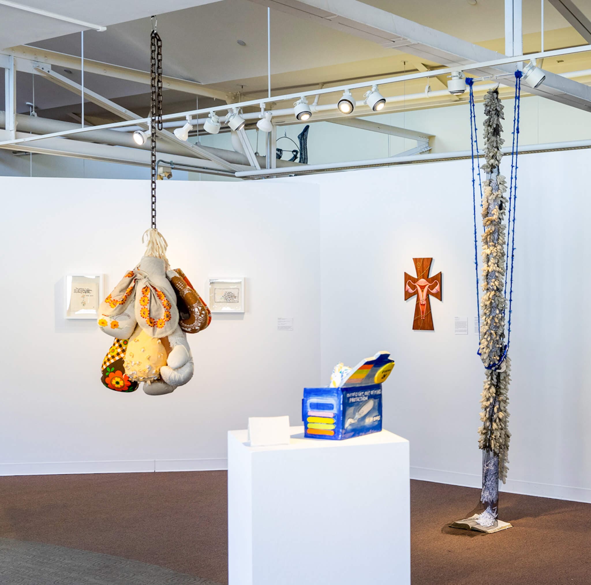 Installation view, “Deeply Rooted: Faith in Reproductive Justice,” Kniznick Gallery, Hadassah-Brandeis Institute. Curated by Caron Tabb. Left to right: Cora Ramirez-V, Andi Arnovitz, Dell M. Hamilton, Zoë Buckman, Safarani Sisters, Susan Chen. Photo by: Elizabeth Ellenwood.