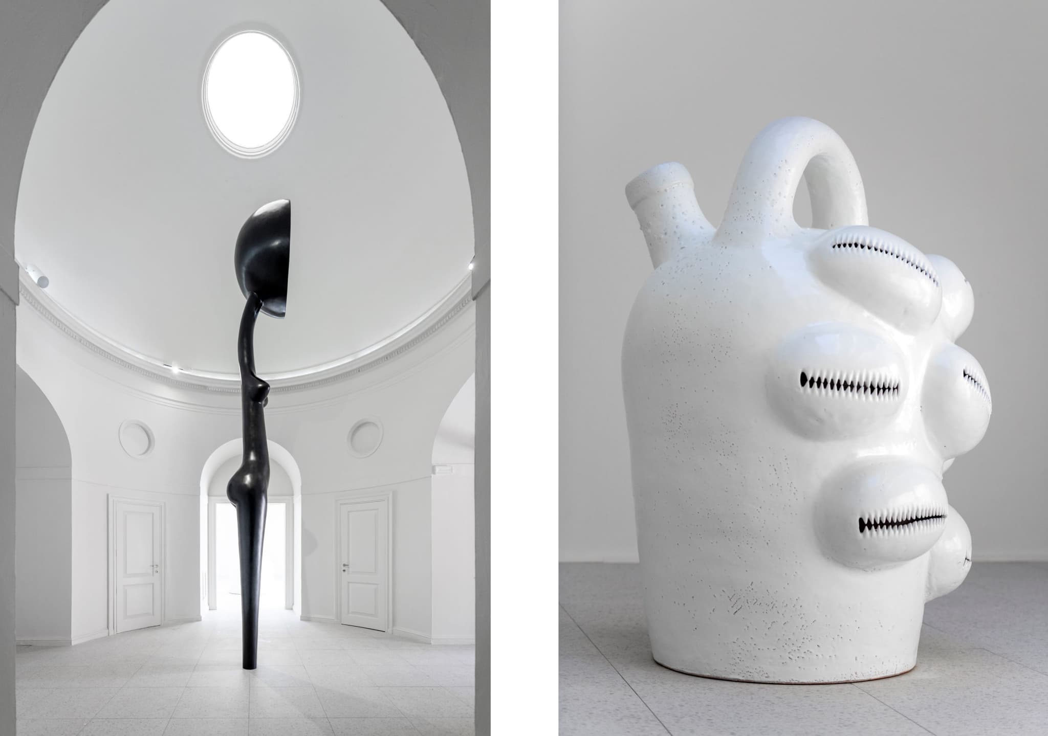In the Pavilion’s rotunda, the towering bronze Sentinel stretches up high with the satellite dish reappearing once again in place of the figure’s head. On the other side, Leigh’s portrait and tribute to Sharifa Rhodes-Pitts depicts the writer at a stature twice her size with her head tilted slightly downward and a foot emerging from under her skirt—a reference to the ancient Egyptian tradition of immortalizing gods with a foot stretching toward eternity. In the final gallery, the motifs, symbols, and materials seen throughout the exhibition culminate together. In Cupboard, a raffia skirt forms the base for a cowrie shell head, a ceramic sphynx lurks by the door, and a cobalt blue headless figure called Martinique guards the corner.