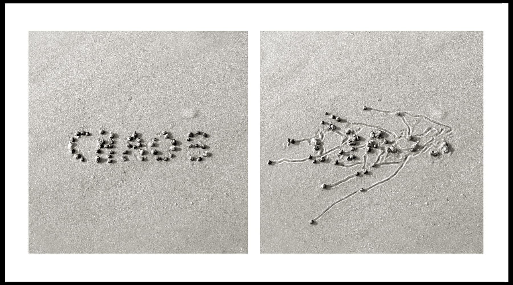 Ranalli arranges the snails, for the most part, in geometric formations: a triangle, a spiral, an infinity symbol, a line. (Sometimes he adds another object, like kelp or a stone, to the configuration—perhaps merely for aesthetic purposes, or perhaps to influence the snails’ paths.) In one image, aptly titled Chaos Theory #2, the snails spell out the word “CHAOS” in capital letters. In the corresponding “after” photograph, the letters dissolve as the snails embark on their own wayward journeys, some heading toward the top of the image’s frame, others toward the bottom, a few stragglers lingering behind in their original spots. “CHAOS” has dissolved into chaos; order has given way to disorder. Or has it? The snails’ tracks might appear random at first glance, but a longer perusal reveals a certain pattern in their movements. None of the snails in Chaos Theory, for example, head toward the right side of the frame. And in the nearby Snail Drawing: Stone #3, which features a ring of snails around a rock, nearly all of the snails have turned back to the rock by the time the second photograph has been taken. If “Snail Drawings” is about the futility of human attempts to structure the world, it is also about the world’s inherent structure.