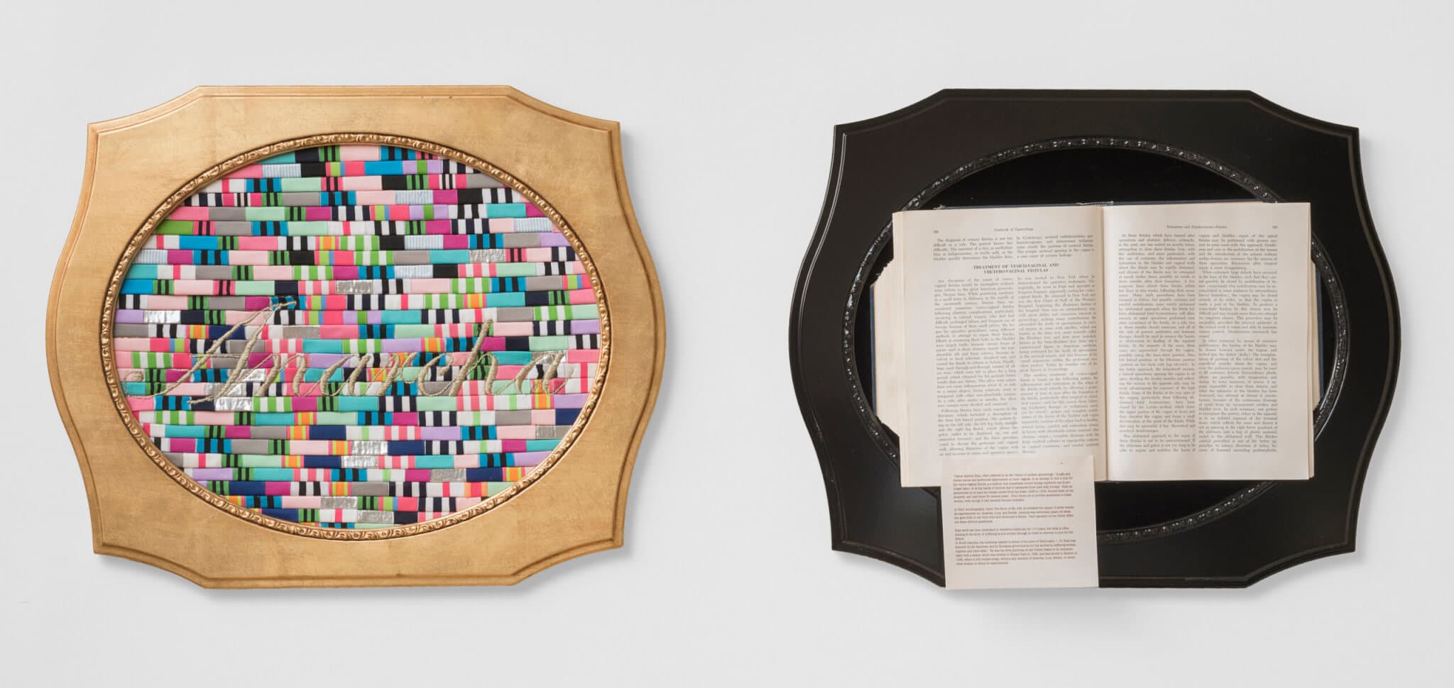 Michelle Hartney, Anarcha, 2014. Mixed-media sculpture (diptych): grosgrain ribbon, metallic embroidery floss, vintage obstetrics text. Dimensions variable. Photo courtesy of the artist and the Hutchins Center for African and African American Research, Harvard University.