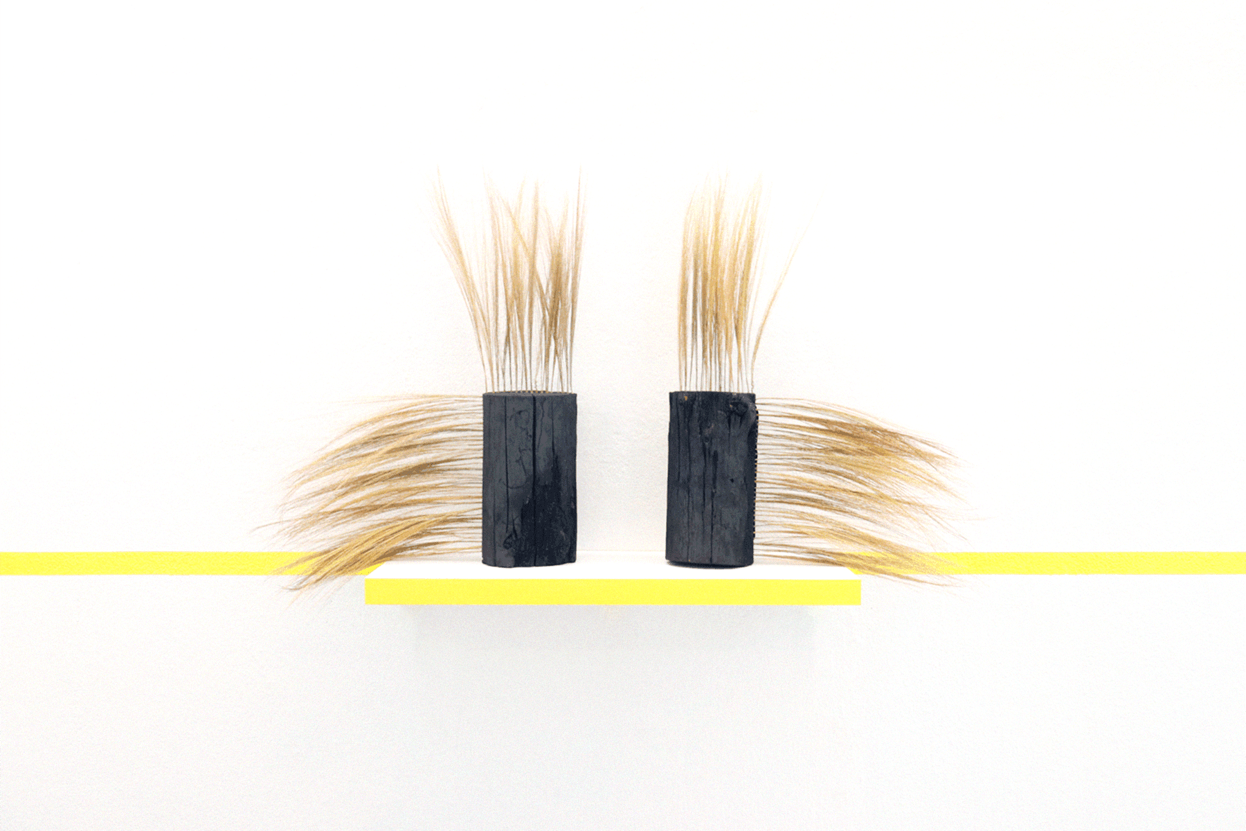 Andrius Alvarez-Backus, Twin Regenerations, 2023, charred pine, tambo (tiger grass), 30″ x 52″ x 7″. Image courtesy of Fitchburg Art Museum.