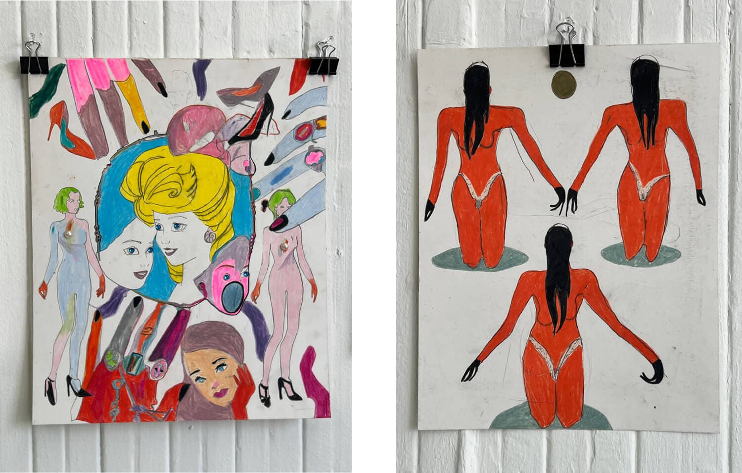 Left: Caleb Yono, Femme Flotsam, 2020. Colored pencil and plastic gems on paper. Photo courtesy of Shoe Bones Gallery. Right: Caleb Yono, Inter dimensional Femmes / Moon Bath, 2023. Photo courtesy of the artist.