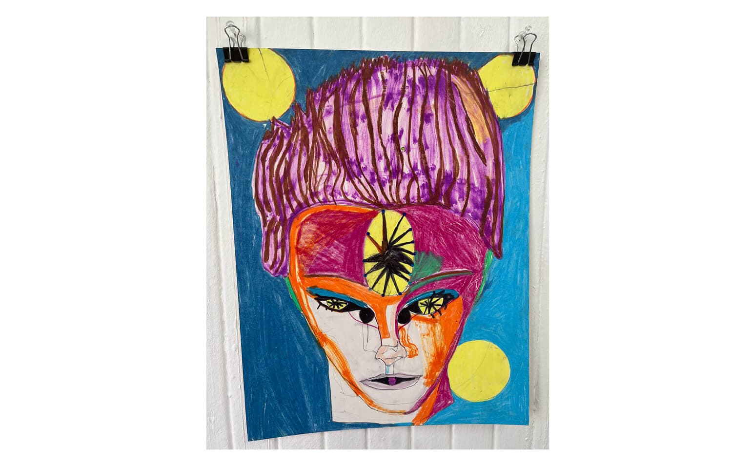 Caleb Yono, Inter-dimensional Femme/Self Portrait with Star, 2020. Colored pencil and plastic gems on paper. Photo courtesy of Shoe Bones Gallery.