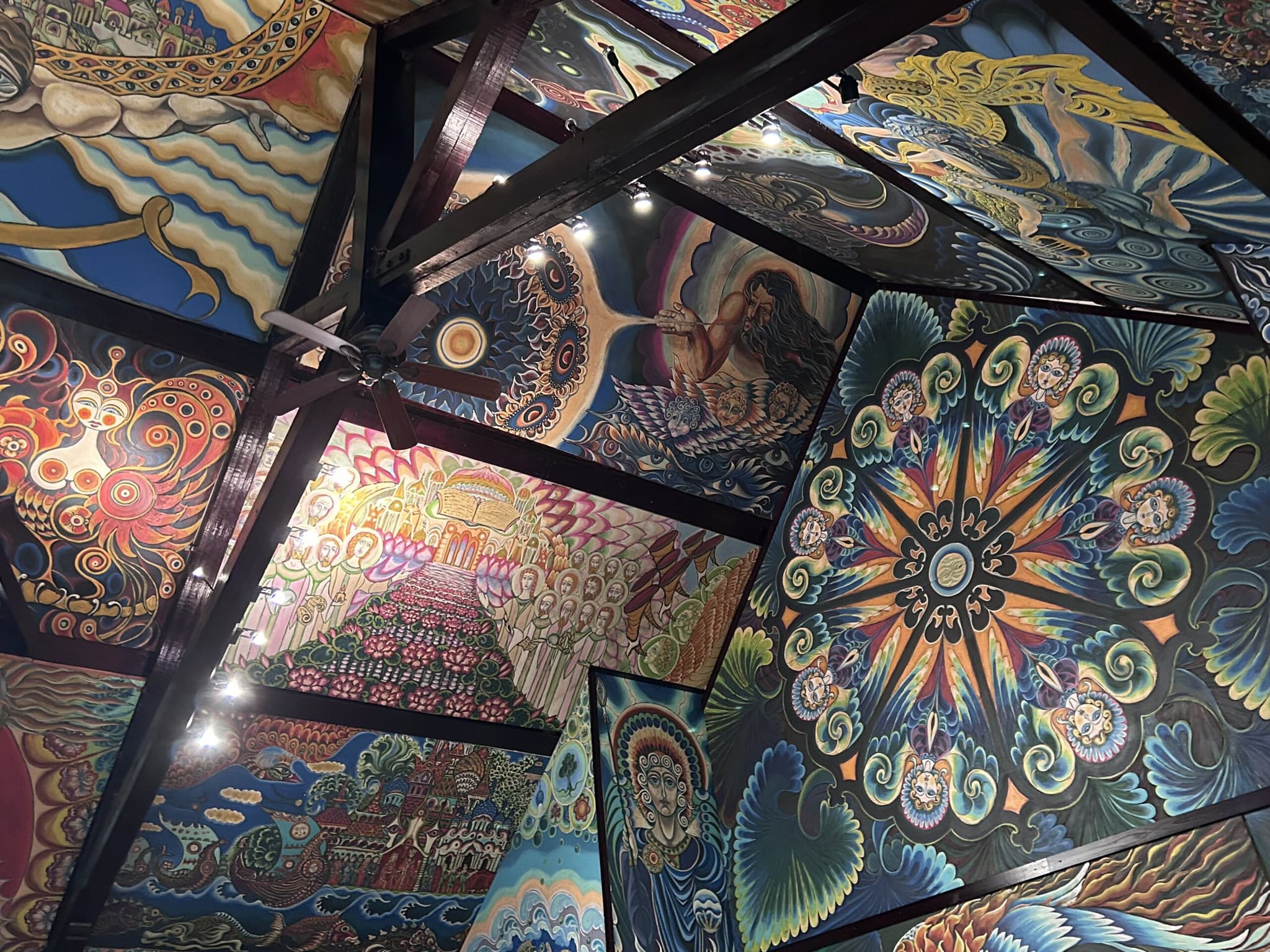 For the Museum of Modern Renaissance, the spiritual is intensely personal. Painting and the act of creation is the ceremony, Shaplyko and Sorokina the celebrants. As a visitor there are no liturgical expectations other than walking around with craned necks, interpreting each painting and decoration as it appears to you. The aesthetics of the museum are the spirit of the place and the varied cosmologies splayed over the museum’s walls are joined by a simple through line of being rendered in paint. The walls and sculptures hum with life, together welcoming the visitor to imagine their place in the cosmos a bit differently. If this whole painted universe of the museum’s interior can come from two skilled pairs of hands, then maybe our world, with all its unexplainable complexity, is held together by some energy so elusive it can only be referred to in paint.