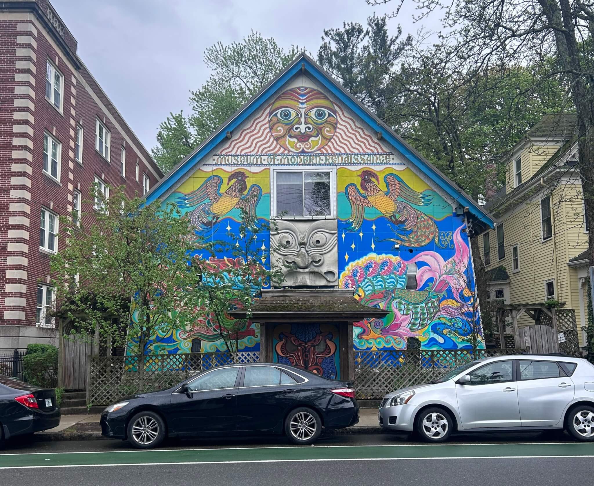 As I finish my walk to Lot #198, I approach the multicolored, multi-faced facade of the Museum of Modern Renaissance. Looking not left nor right as I jaywalk, I lock eyes with a heavy-browed painted face peering down at me from above the museum’s front door. The building itself is the same plain frame constructed by the Unitarians in 1909, now adorned and painted with bright splashes of storybook color. Above the leering face, two symmetrical roosters soar upward to a smiling sun, waves of orange rays descend down to a curly declaration: “THE MUSEUM OF MODERN RENAISSANCE.”