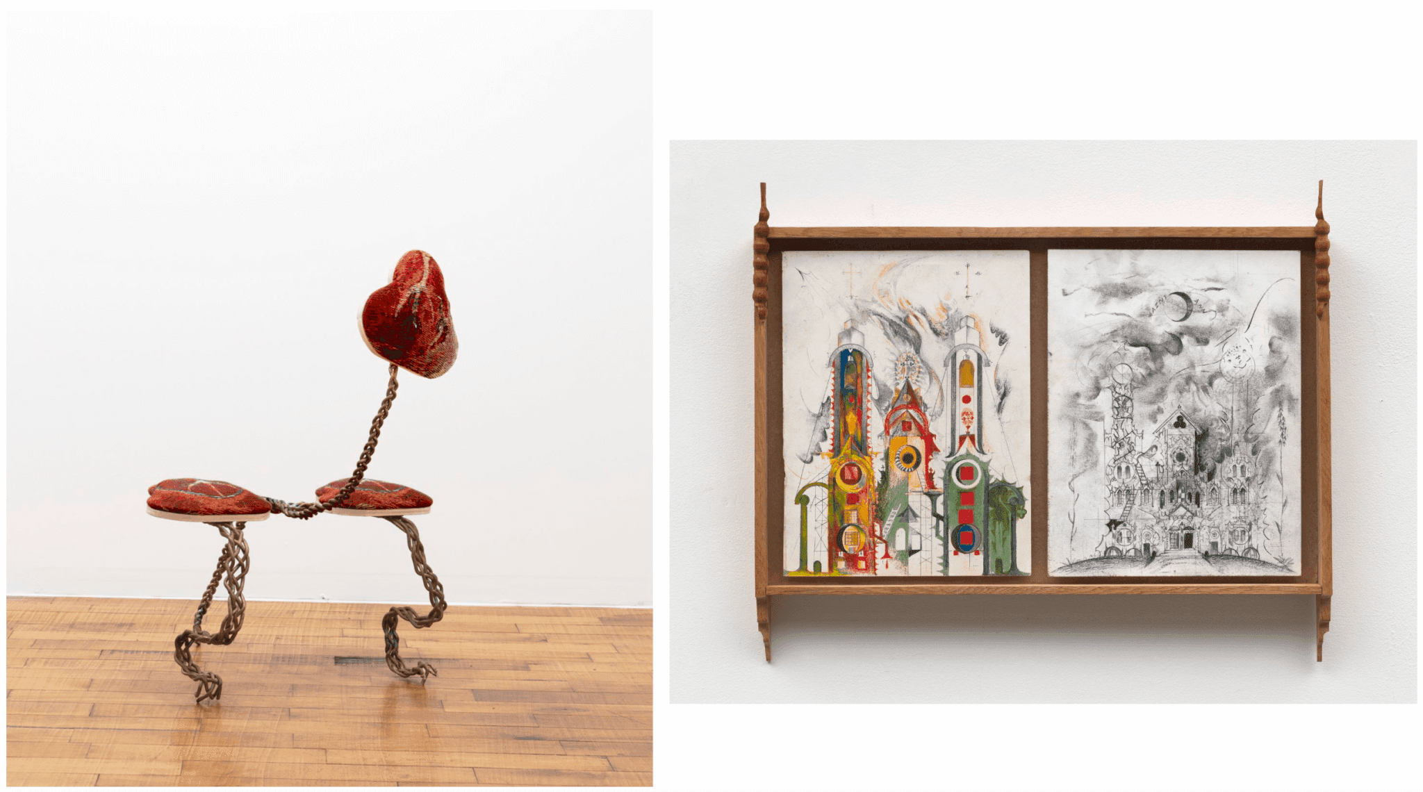 (left) Brittni Ann Harvey, Weeping Willow Angel (Robot Dog on Hind Legs), 2021. Polyester on jacquard-woven fabric, plywood, polyfill, bronze. 19 × 30 × 18 in. Courtesy the artist and Someday, New York. (right) Harry Gould Harvey IV, Presupposition of Saint Anne, 2023. Colored pencil, charcoal, xerox, white oak from Prudence Island. 19½  x 16 x 2¼  in. Courtesy the artist, KADIST Collection.