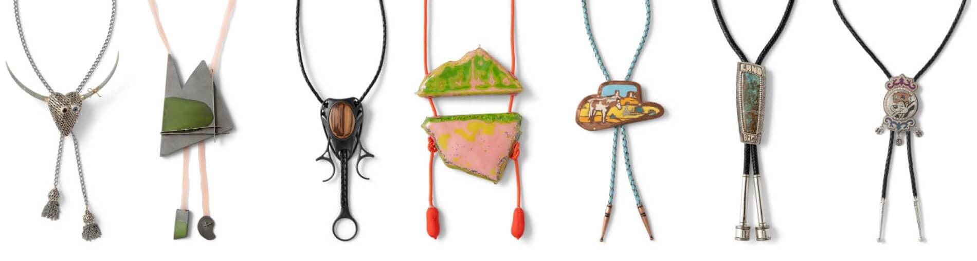 For this traveling exhibition, thirty artists created their own versions of the bolo tie, often utilizing unexpected elements, like hand-painted flowers, pearls, and braided hair. Their modern takes make for untraditional and funky designs that lean into the bolo tie’s versatility, shedding its stereotypical, hyper-masculine symbolism, and transforming it into a form of adornment that tells meaningful stories of historical erasure, gender fluidity, and cultural traditions.